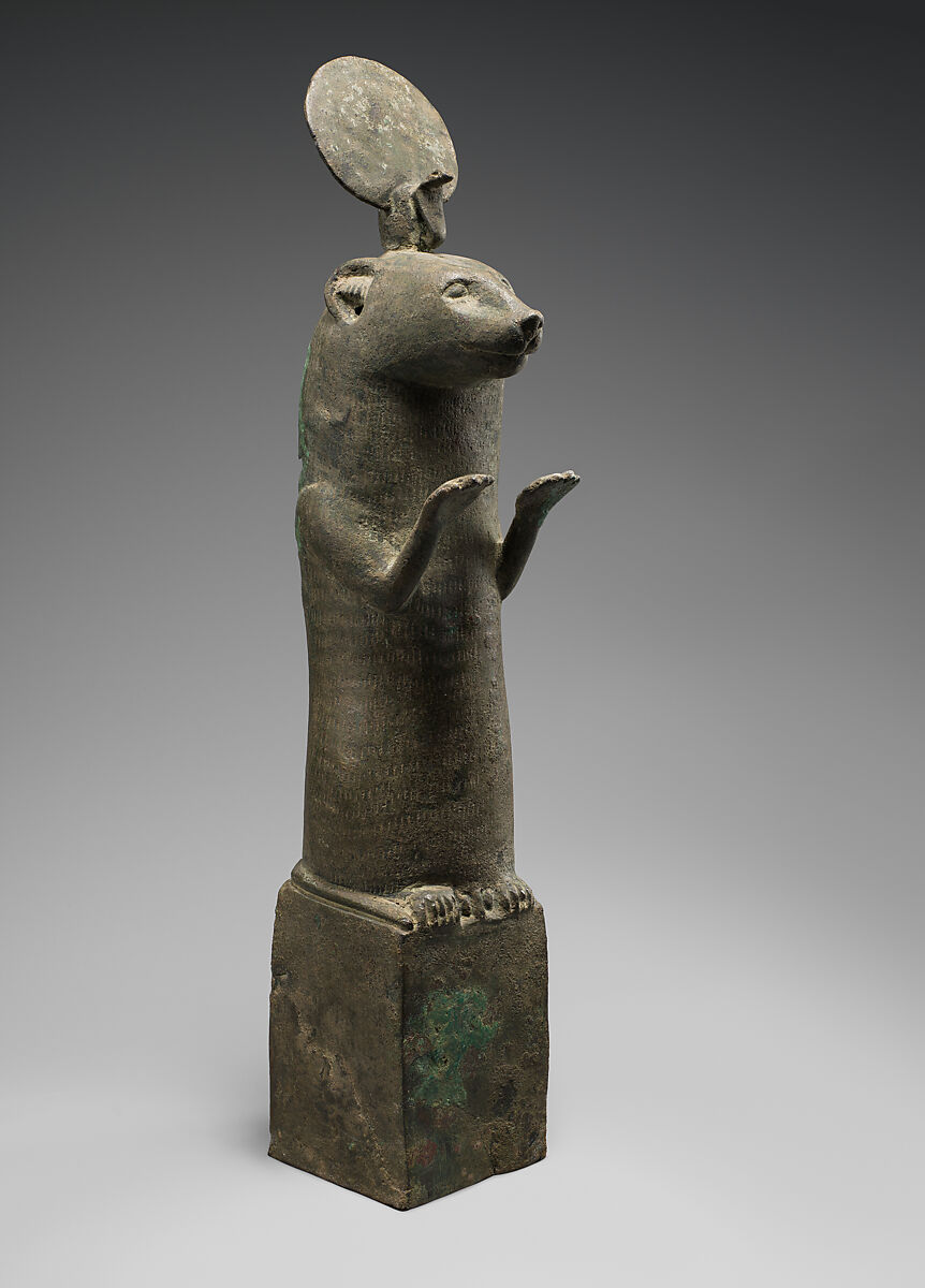 During the Late Period and Ptolemaic times mongooses were represented in bronze statuettes such as this one, standing, forepaws raised, atop small bronze boxes. The pose of raised paws signifies the animal's adoration of the sun god when he rises in the morning. Some scholars have identified these animals as otters rather than mongooses.