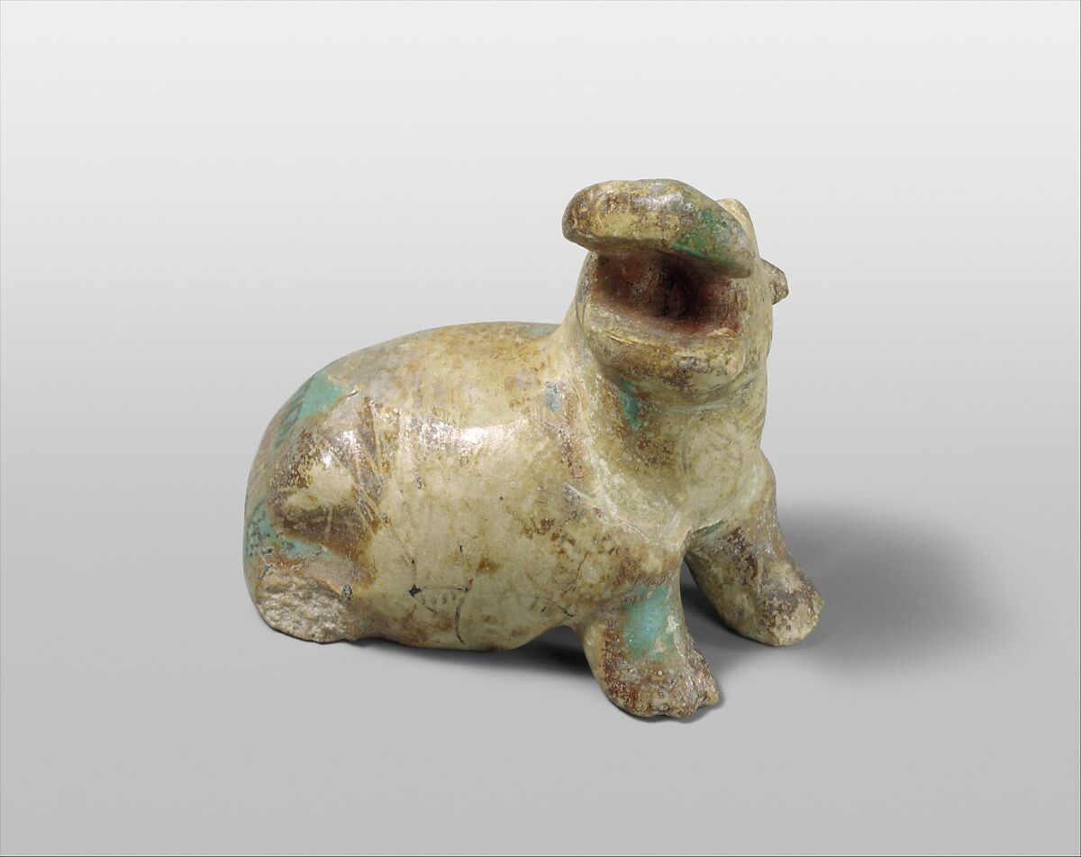 This seated hippopotamus is depicted with its head turned to the side and its mouth open. This could either indicate that the hippo is roaring, or baring its teeth, which hippos do when feeling threatened, to intimate their opponents. The inside of the hippo’s mouth is painted red.