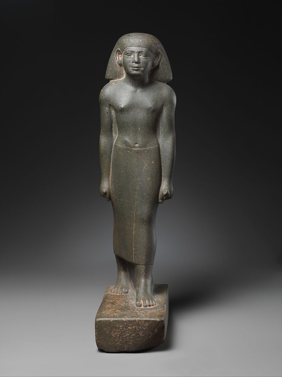 William C. Hayes has rightly called this the "finest of the Museum’s standing figures in stone." The impression of utter perfection conveyed by the small image is based on its even proportions and the balance between the forward movement of the left leg and the slight upward lift of the head. With these formal qualities, an attitude of equilibrium is expressed, which ancient Egyptians considered ideal human behavior. "Patience is a man’s monument, quietness is excellent, calmness is good." These and many similar admonitions were taught to the aspiring member of ancient Egypt’s elite.
