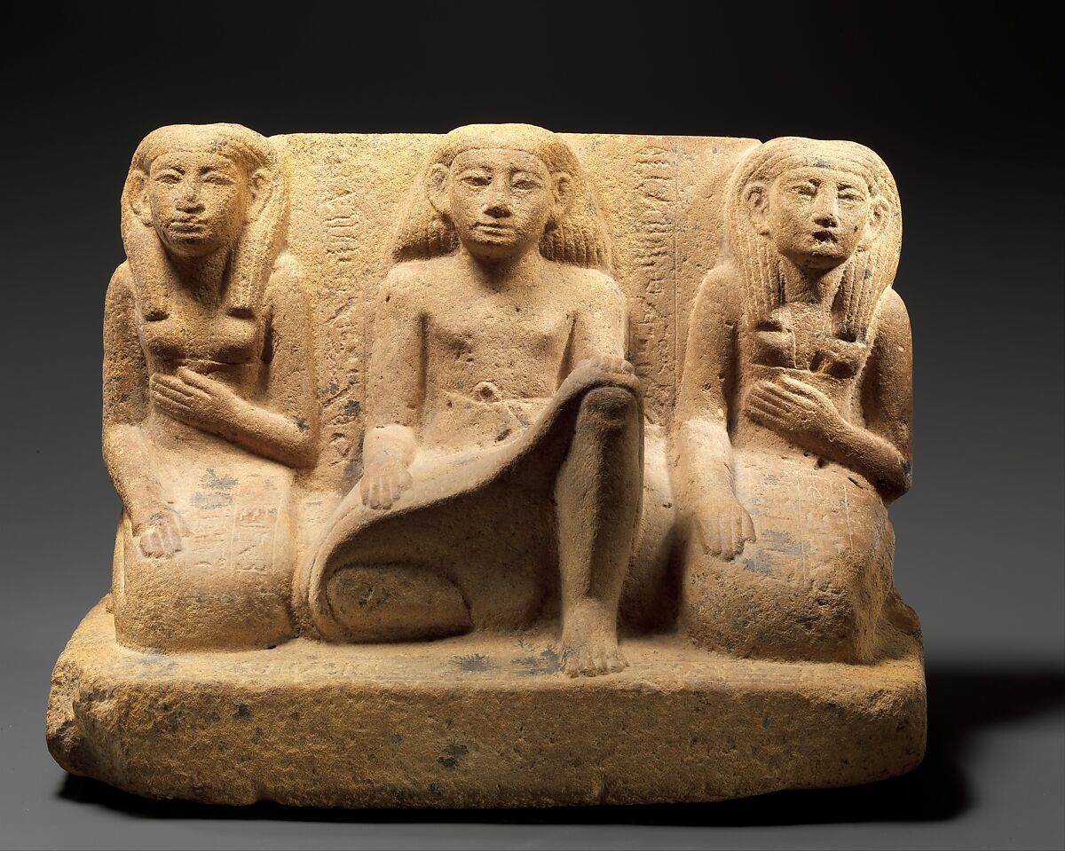 Senbebu, the central figure of this group, was an overseer of stonemasons, a title indicating that he supervised quarrying and/or stonecutting, professions also held by his father and son. Abetib on the left was likely Senbebu’s wife, while Peryt on the right was either another wife or perhaps a sister-in-law. During the Middle Kingdom, mid-level officials such as Senbebu were increasingly able to commission commemorative monuments of respectable quality.