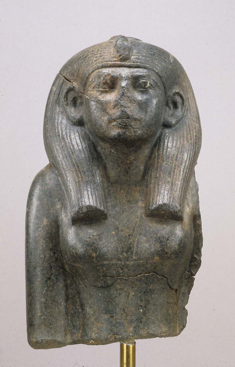 This typical representation of a royal woman shows the usual uraeus serpent at her brow. The square shape of the face and the voluminous hairstyle place the piece in the middle of Dynasty 12. Just enough is preserved of the proper right arm to show that it was bent: the royal woman was originally represented seated.
