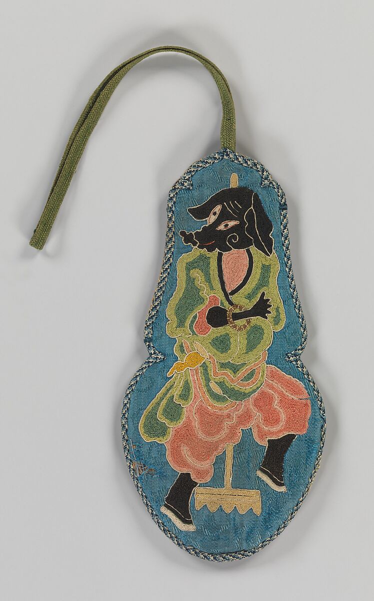 The imagery on this bag is taken from the Xiyou ji (The Journey to the West), a Ming-dynasty (1368–1644) text based on the historical pilgrimage of the Buddhist monk Xuanzang (596–664) from China to India for the purpose of bringing back Buddhist scriptures. The boldly rendered, pig-faced creature is Zhu Bajie, one of Xuanzang’s supernatural animal companions, shown here with the rake he uses as a weapon.
