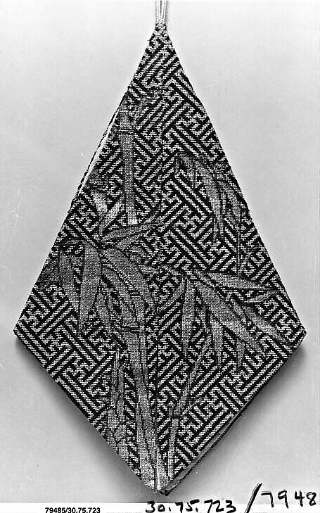 Bamboo, a favorite subject in Chinese art, is seen here on a typically Chinese background. The fretwork incorporates the broken cross, or swastika—an ancient symbol in Asia that is associated in China with the character wan, which denotes the number ten thousand and symbolizes longevity. The incorporation of the symbol into an unending pattern emphasizes its meaning.