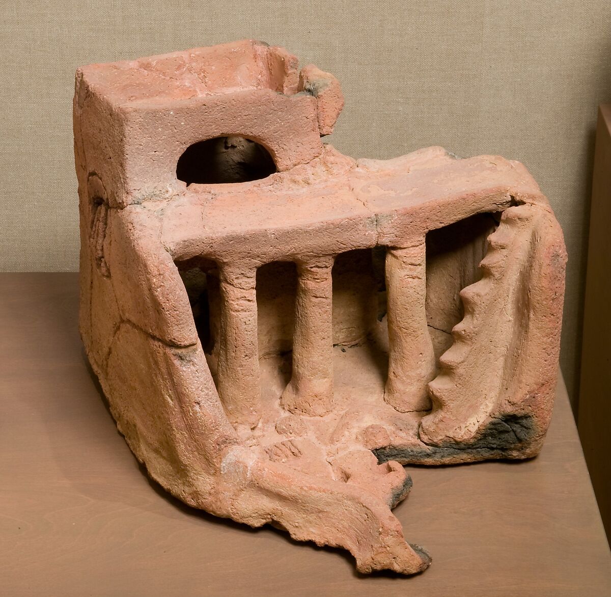 This model from Rifa of the "soul house" type represents a house with a three-columned portico behind a walled courtyard; in front of the courtyard a libation spout is partly preserved. A stairway on the right gives access to the roof of the house, where an arched opening represents a feature in actual houses through which cool air was conducted into the main bedroom. On the left wall of the house a barred window is indicated. A mid-thirteenth dynasty date for this particular house model is indicated by the pottery found in the burial with which it was associated.
