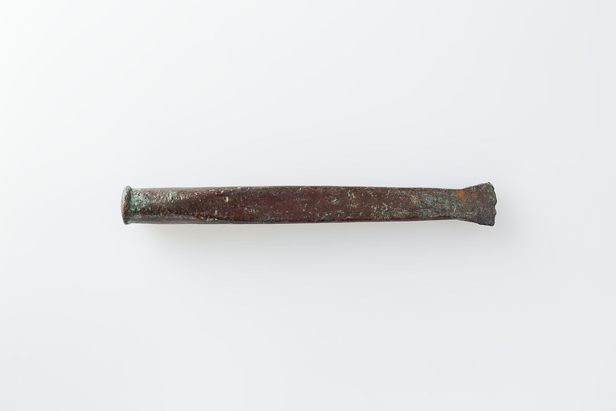 This chisel was clearly made for use and looks as if it has indeed been used. It was found in a tomb that contained at least six burials but no object of demonstrably post-Mentuhotep II date. There was even a piece of linen marked for Mentuhotep II's wife Queen Neferu. The mark incised into the chisel was previously understood to represent the pyramid which Museum excavator Herbert E. Winlock and others thought had originally existed above the solid core structure of the temple of Mentuhotep II at Deir el-Bahri. The existence of this pyramid has been put into doubt, however, although renewed discussions are under way. The mark also occurs on linen sheets from the tomb of the "Slain Soldiers" (MMA 507 see here 27.3.84-134), which has been shown to be of the time of Senwosret I, and on another piece of linen found at Lisht South close to the pyramid of that king. The sign can, therefore, no longer be exclusively associated with the temple of Mentuhotep II at Deir el-Bahri, even if this particular chisel was made and used during that king's reign. The mark's form and purpose remain enigmatic.