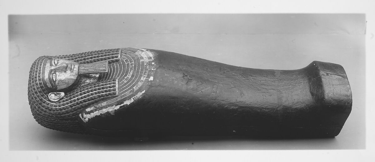 This mummiform coffin was found nested inside two larger rectangular coffins (see 12.183.11a and 12.183.11b). Inside was the mummy of an middle-aged man, now in the Peabody Museum at Harvard. It is made of wood covered with linen to which was applied a thick coat of black pitch. Both the gilded face and tripartite wig, which was overlaid with rows of black faience inlays, identify the deceased as divine. The long trapezoidal beard is of a type previously reserved for royalty, and the extensive broad collar is modeled in stucco that has been painted red, green, and black with stripes of gold foil between the rows.