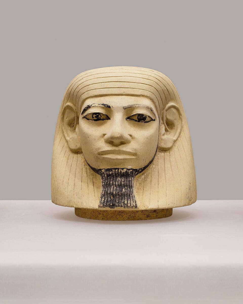 This sculpted head was the lid of a canopic jar, one of the four containers for the organs that were removed during mummification. In previous periods, canopic jars had simple disc-shaped or hemispherical lids. In the late First Intermediate Period to early Middle Kingdom, however, lids in the form of human heads were introduced.