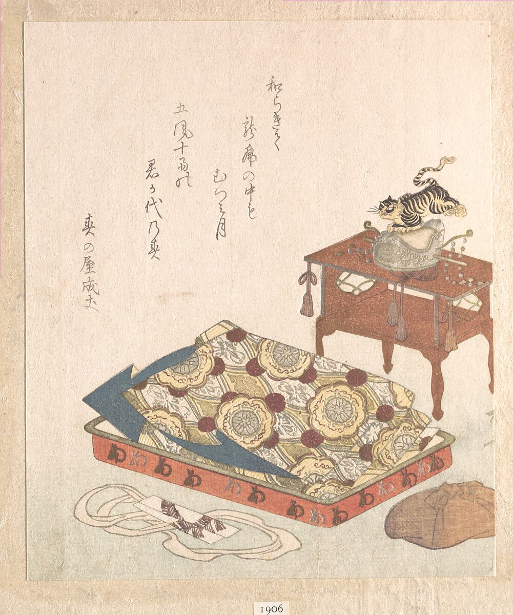 Surimono are privately published woodblock prints, usually commissioned by individual poets or poetry groups as a form of New Year’s greeting card. The poems, most commonly kyōka (witty thirty-one-syllable verse), inscribed on the prints usually include felicitous imagery connected with spring, which in the lunar calendar begins on the first day of the first month. Themes of surimono are often erudite, frequently alluding to Japanese literary classics in both texts and images.