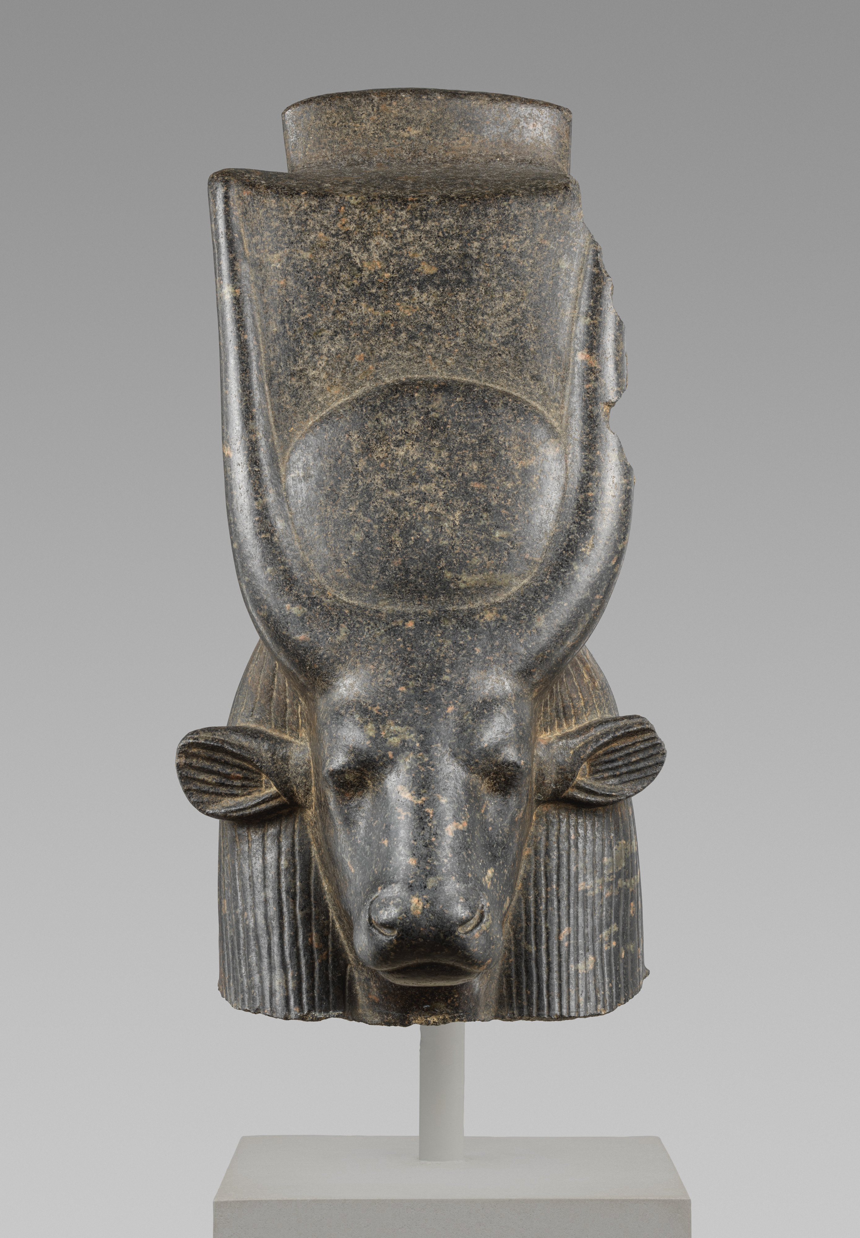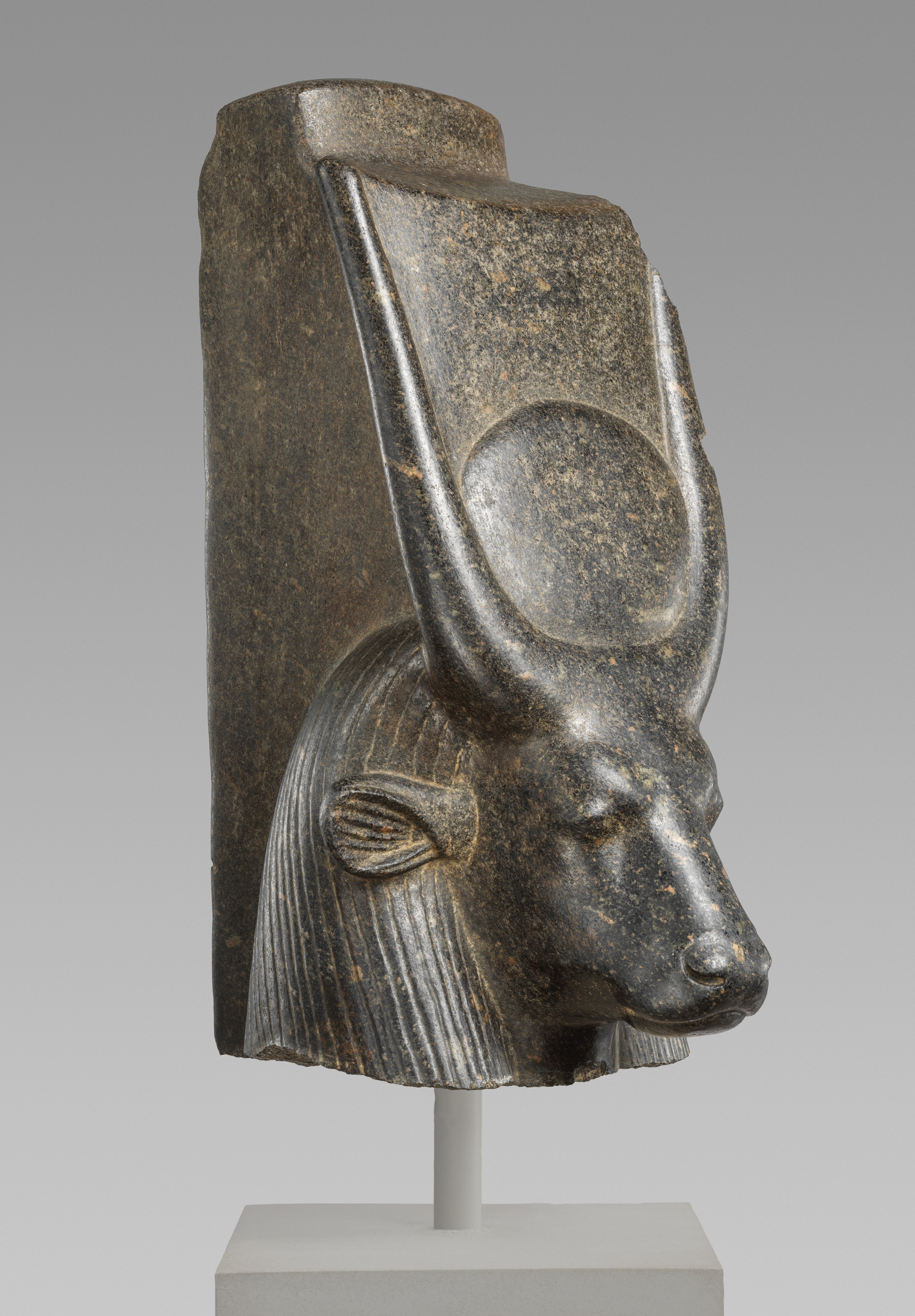 The head depicts a goddess with a cow’s face and this zoomorphism and the sun disk between her horns convey divinity. The subject matter and the animal’s benevolent expression, along with the skillfully carved dark stone, suggest the statue dates to the reign of Amenhotep III.