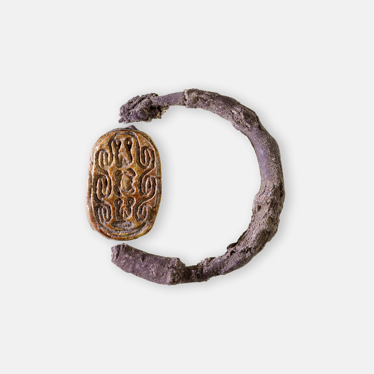 The burial the House Mistress Ruiu was found in the tomb of her father, Neferkhawet, which was excavated by the Museum’s Egyptian Expedition in 1935. On the left hand of Ruiu's mummy were three scarab rings. The scarabs were made of glazed steatite and the ring bands were silver. The scarabs had been mounted by passing a silver wire through a hole running from head to tail. The wire was then lashed to the ring with finer silver wire. Silver deteriorates over time when exposed to dampness, and the rings were badly corroded. The scarabs were all originally glazed blue, but the glaze has almost entirely disappeared from wear and from the damp conditions inside the tomb.