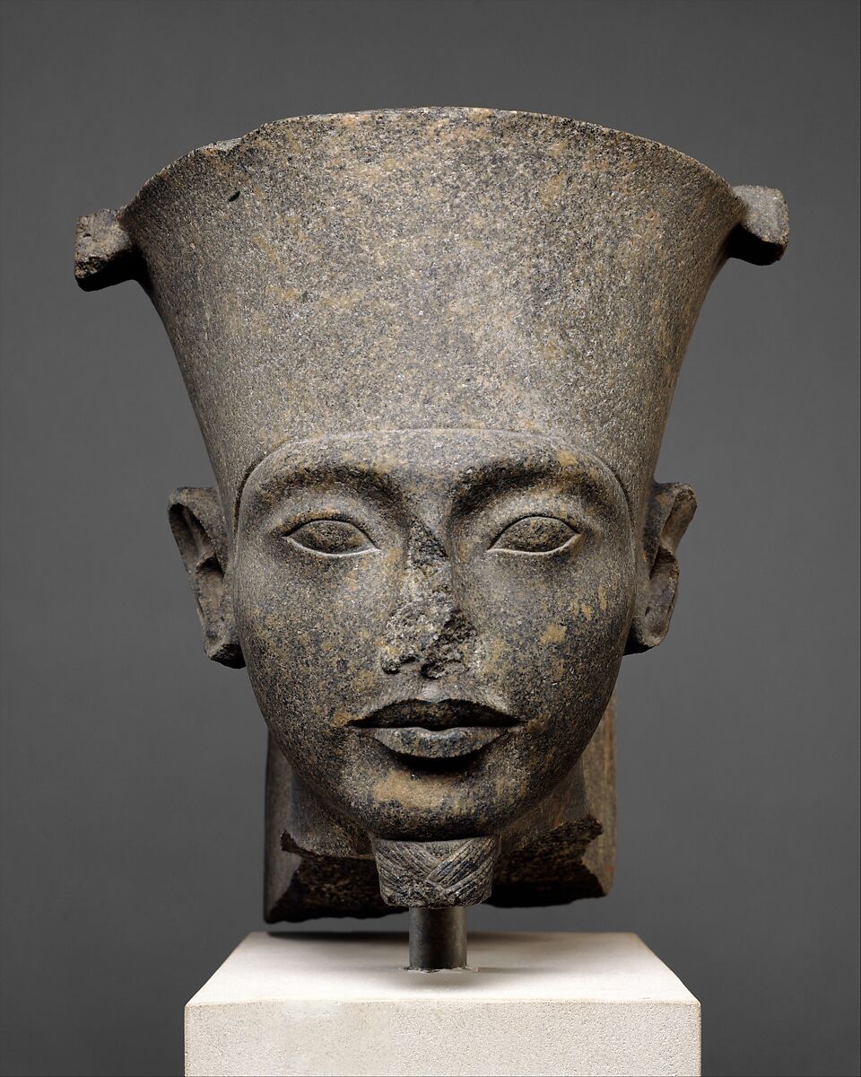 The braided beard and the flat cap with remnants of double plumes identify this god as Amun. His small eyes are separated by a curved depression from the rounded brow ridge; his broad face shows full lips with sharp contours, and, from the side, a slightly drooping chin. These features closely parallel those of King Tutankhamun and mark the piece as his commission. The statue was certainly created for Karnak, Amun's great temple at Thebes, as part of Tutankhamun's restoration of the god's monuments that had been defaced or destroyed during the reign of Akhenaten. A number of sculptures depict Amun touching the crown of Tutankhamun, who stands or kneels before him. This head seems very large for such a composition, however; thus it is likely that the head originally belonged to a large freestanding or seated figure of the god.