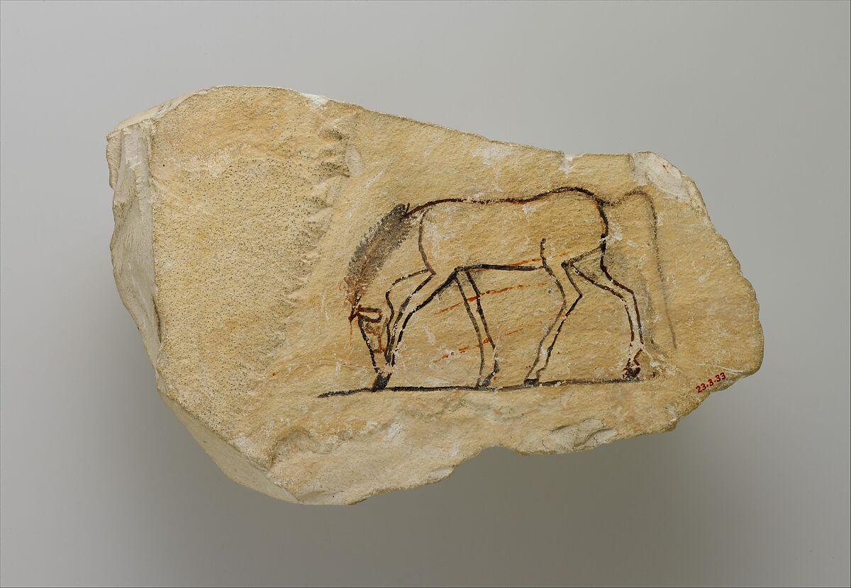 The horse (23.3.33) and leaping lion (23.3.28) are done with red preliminary sketches, finalized with a thin, supple black line; this technique resembles that of the Ramesside artists from Deir el Bahri. The incised crocodile (23.3.30) relates best to ostraka known from the Ptolemaic Period.