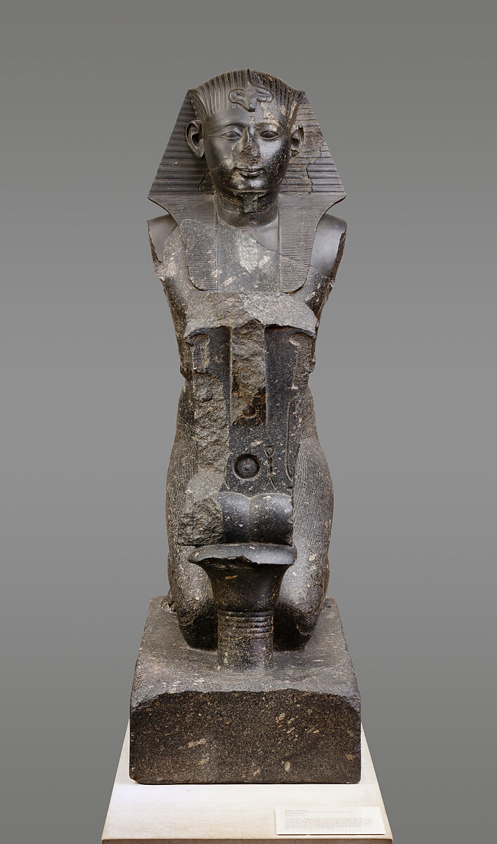 This kneeling statue of the king shows him making offerings to Osiris and was probably intended for his temple at Abydos. The same high artistic standards that are seen in the reliefs of Seti I are evident in this statue and the face seems to be reminiscent of earlier kings of Dynasty 18 such as Thutmose III.