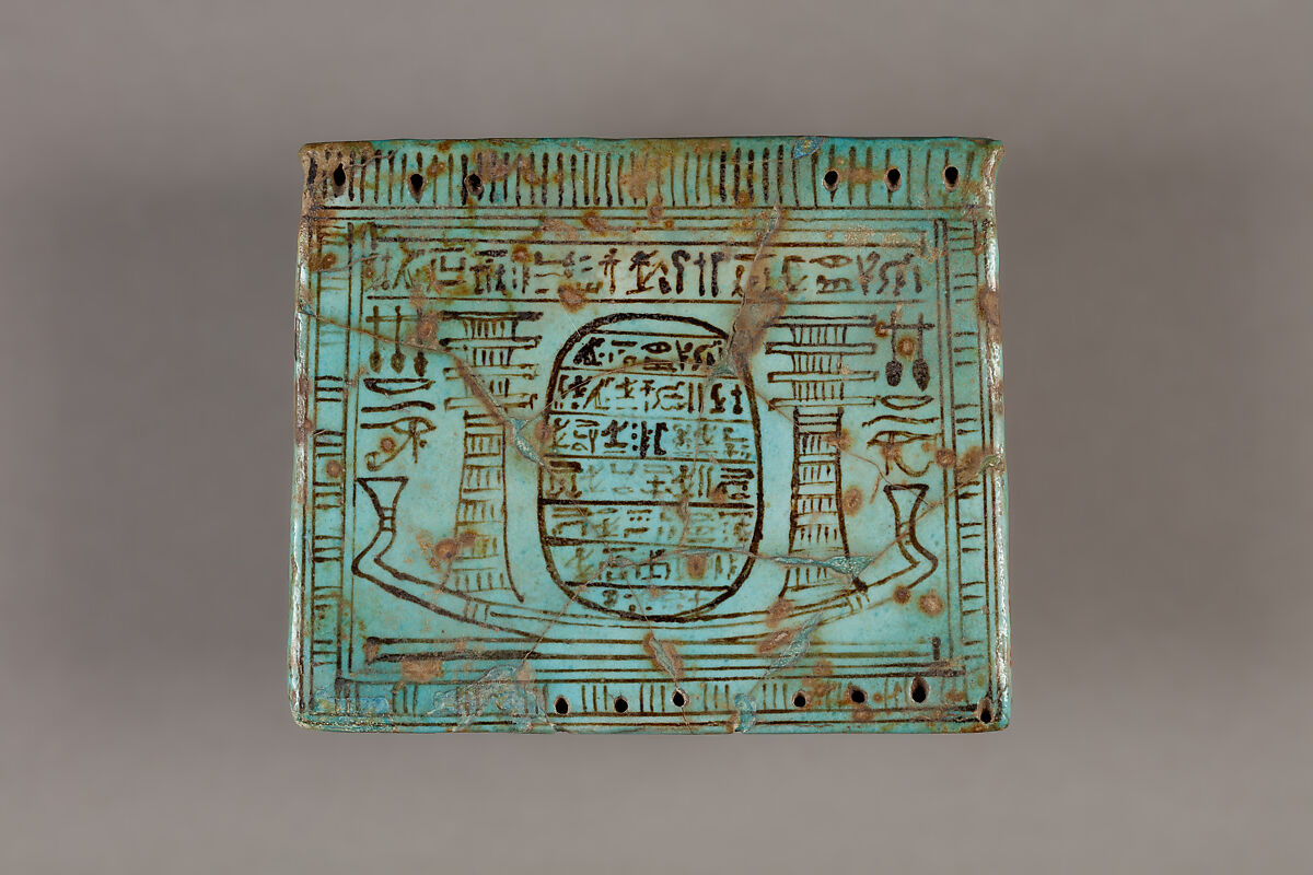 This pectoral would have been placed over the chest of the deceased, and probably sewn to the mummy’s wrappings, as the pierced holes at its top and bottom suggest. The pectoral is shaped as a pylon with a cavetto cornice. The front panel shows two kneeling figures adoring a scarab and the reverse with a boat with twin Djed-pillars. In the middle, the scarab’s back appears inscribed with a spell--often found in Books of the Dead—that addresses the deceased’s heart (see translation).