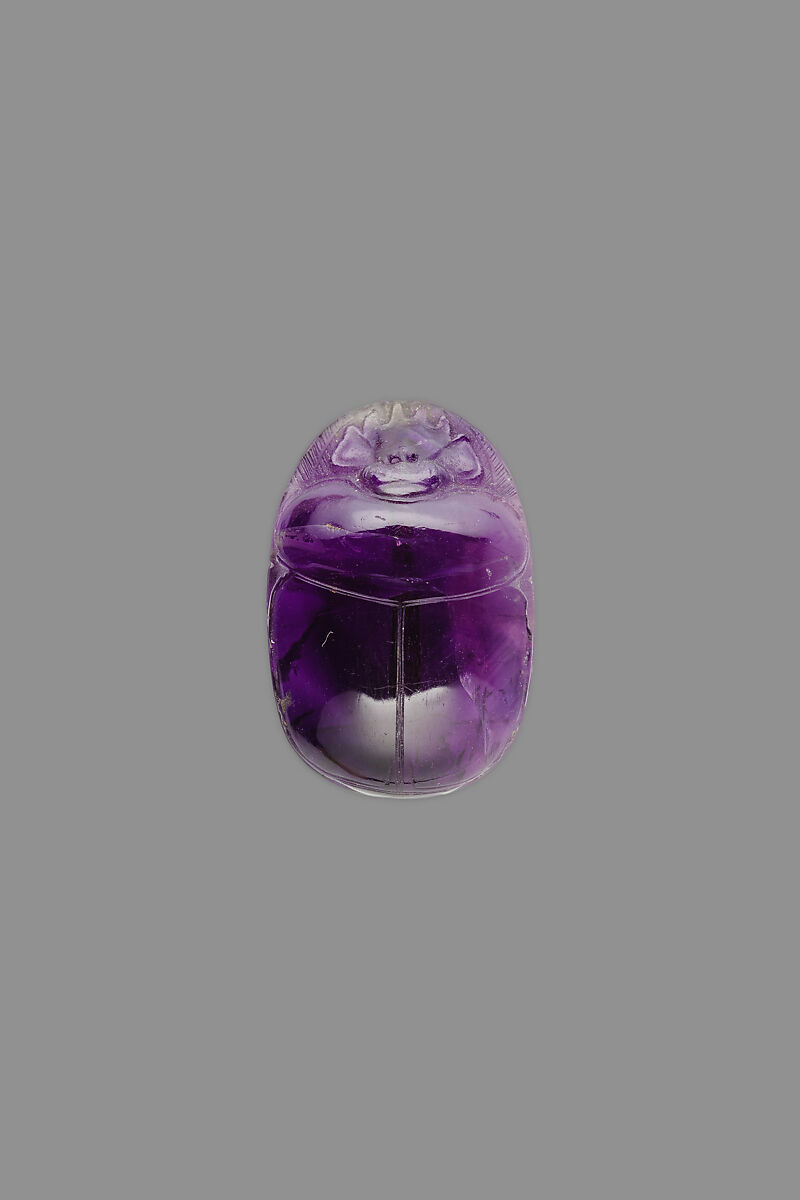 This scarab was made out of amethyst, a semi-precious stone. Polished to a striking degree, the piece has a beautiful reflective surface that might have alluded to the sunlight. The amulet’s flat underside is undecorated, which is often the case for scarabs in semi-precious stones. Possibly the shape and material of such scarabs might have been regarded as providing enough magical power without added text or images, though an additional inscribed gold plate might have originally covered the scarab’s base.