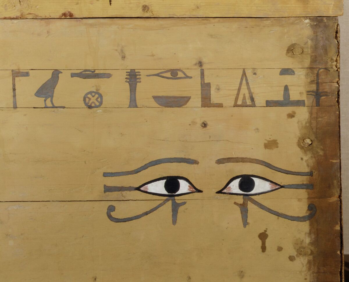 Wah's coffin was made of a coniferous wood (cedar or spruce) and painted yellow. Offering texts were written on the lid and around the upper edge of the box. A pair of eyes was also painted at the head end of the coffin's proper left side, as was customary in the Middle Kingdom.