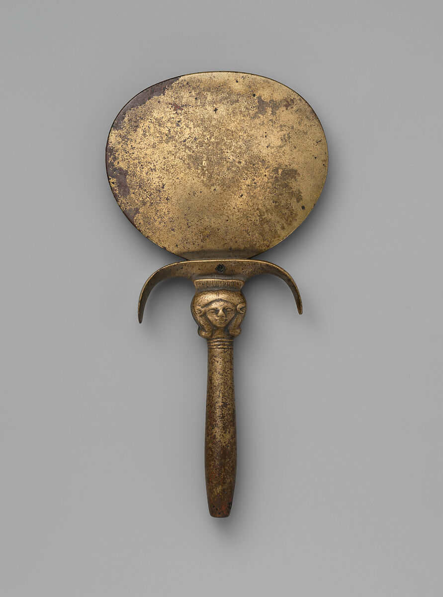 This mirror is made of copper alloy cast in two pieces. The disk has a tang that fits into a hole in the handle and is held in place by a small bronze peg. The handle is decorated with the emblem of the goddess Hathor. The mirror was found in the bottom of a coffin discovered in the tomb of Hatnefer (36.3.1). A number of other objects in the Museum's collection had been placed in the same coffin including a bowl and two dishes made of faience (36.3.8–.10), a wood cosmetic box (36.3.11a, b), another mirror (36.3.12a, b), and five amulets (36.3.20–.24).