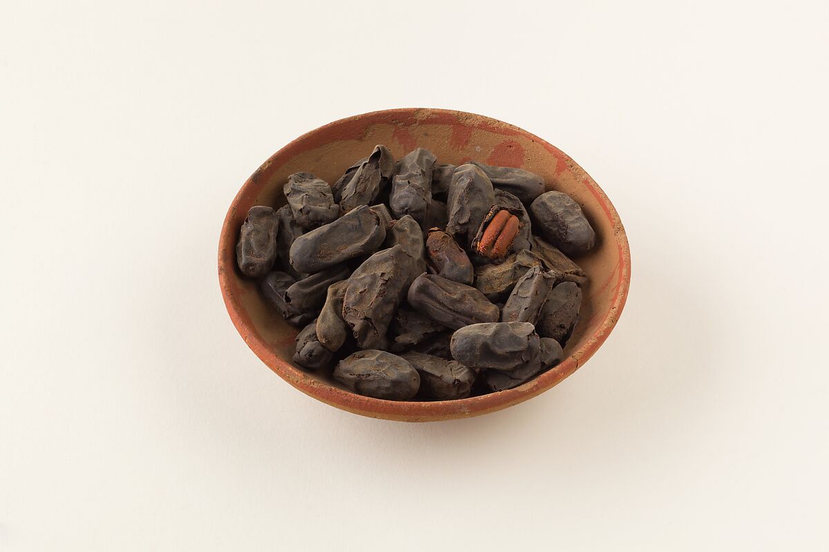 In Hatnefer's tomb (36.3.1) there was a large oval basket (36.3.57) which contained food for the spirits of Hatnefer, her husband, Ramose, and six un-named family members buried there. Inside the basket were dates (shown here and in 36.3.66), raisins (36.3.65), loaves of bread (36.3.73), and some kind of bread pudding (36.3.81).