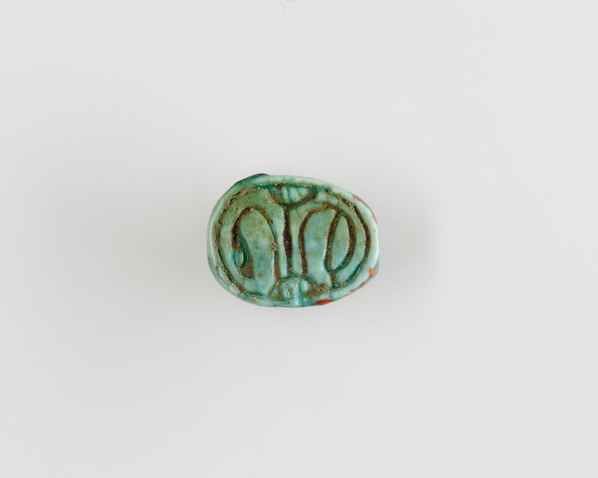 This scarab was found with twenty-three other scarabs and seal-amulets in the coffin of a young woman who was buried in Hatnefer's tomb (see 36.3.1 and 36.3 26). The base is inscribed with a decorative floral pattern.