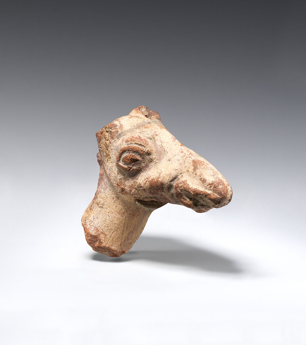This small terracotta head is unpretentious but skillfully modeled. It is the living image of a camel, head held disdainfully upright, the protruding eyes gazing into the far distance, while the soft muzzle seems to be caught in a chewing motion.