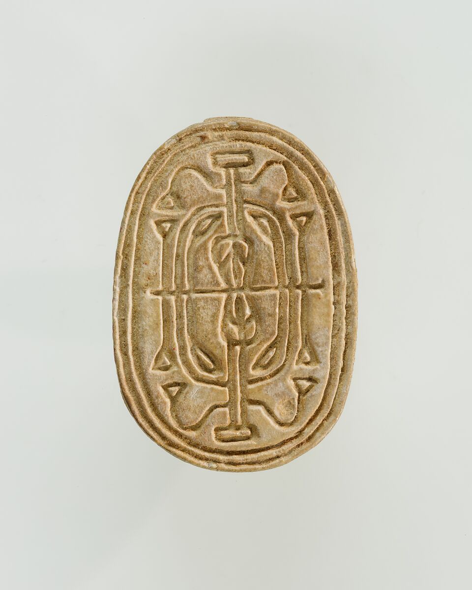 A popular motif on Middle Kingdom scarabs is the sema-tawy, the symbol of the unification of Egypt. The motif consists of a windpipe entwined with lotus and papyrus plants, floral symbols that respectively represent Upper and Lower Egypt. While many early Middle Kingdom scarabs (late Dynasty 11–early Dynasty 12, ca. 2030-1850 B.C.) show the sema-tawy alone, the compositions of the late Middle Kingdom (late Dynasty 12–mid Dynasty 13) often display two sema-tawy motifs in symmetric opposition or combine it with other motifs such as spirals or hieroglyphs. The motif does not disappear after the Middle Kingdom but continues to appear on Egyptian and Canaanite scarabs during the Second Intermediate Period (Dynasty 14–17, ca. 1640–1550 B.C.) when, ironically enough, the kingdom was no longer unified. The accompanying motifs or the details in the shape of the scarab allow dating these scarabs more precisely.