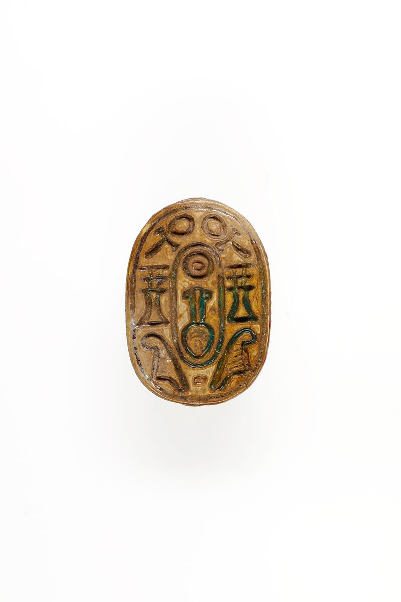 The majority of design scarabs of the late Middle Kingdom (late Dynasty 12–Dynasty 13, ca. 1850–1640 B.C.) are decorated with symmetric compositions of protective hieroglyphs and/or scrolls. This scarab shows the sign for good and beautiful (nefer) and a sun disk placed inside an oval, which is a debased version of the royal cartouche. The combination of signs possibly forms an inscription referring to the sun god Re. The oval is surrounded by symmetrically arranged hieroglyphs such as the sign of life (ankh), the djed-pillar (stability), and the ostrich feather (maat), adding to the protective nature of the amulet.