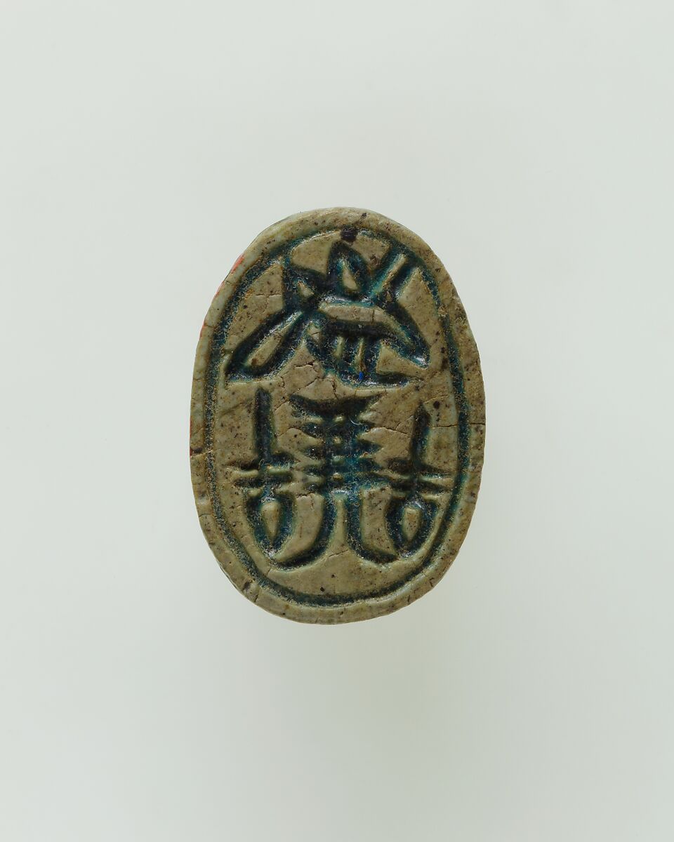 Symmetric compositions of hieroglyphs creating a positive meaning are very popular on scarab amulets during the Middle Kingdom. This scarab shows the sign for endurance (djed) between signs of life (ankh) and a royal symbol, the bee. These hieroglyphs convey benevolent concepts, aimed at providing the owner of the amulet with protection and support. The manner in which the details of the back and sides of the scarab are incised, allows dating the scarab to the late Middle Kingdom (late Dynasty 12–Dynasty 13, ca. 1850–1640 B.C.).