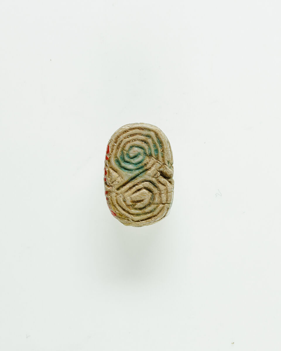 Scrolls and spirals –whether single or interlocking, or in combination with hieroglyphs or floral motifs– already decorate the earliest types of scarabs and are common throughout the first half of the second millennium B.C. While their meaning and source of inspiration remains unknown, scroll designs are also appealing to the eye. A wide variety of combinations, some of which more complex than others, is found on Egyptian scarabs of the Middle Kingdom and scrolls become particularly popular during late Dynasty 12 and Dynasty 13 (ca. 1850–1640 B.C.). While these designs continue to appear on scarabs in the Second Intermediate Period (ca. 1640–1550 B.C.) and on contemporary Canaanite imitations, details in the composition or on the scarab’s back or its legs allow the seal-amulet to be more precisely dated