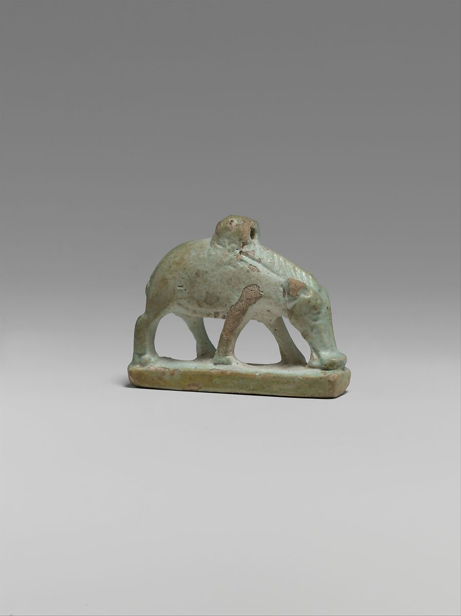 Sows are connected to the sky goddess Nut, who was thought to give birth to the stars each night and swallow them at dawn. Ancient Egyptians sometimes depicted her as a sow, based on the animal’s behavior to eat her own piglets. However, Nut was seen as a protective and motherly goddess. This small depiction of a sow features a loop at the top and was likely meant to protect its wearer.