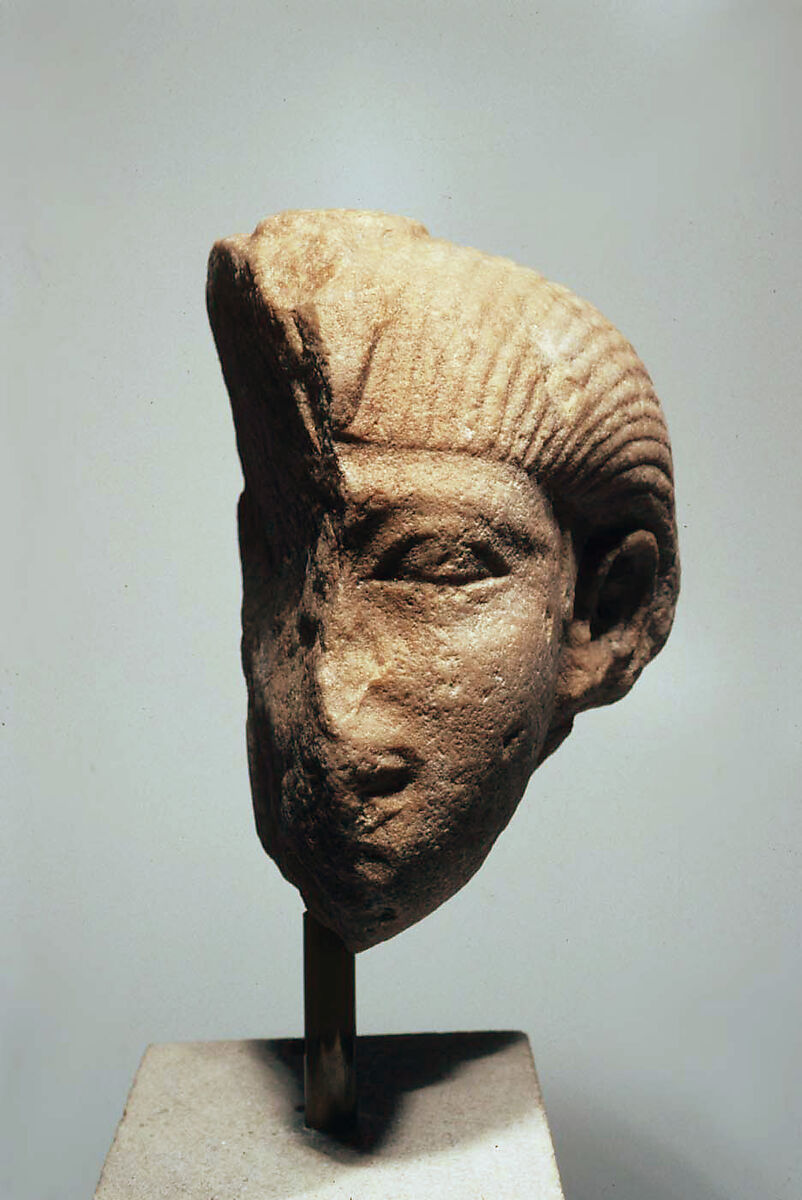 The uraeus serpent marks the royal status of this person, who is wearing an unusual wig with striations running from the forehead to the back. The statue depicts part of the real hair projecting from underneath the wig, in front of the ear. Looking at the head itself, it seems unclear if a man or woman is depicted. The shape of the mouth and the several tight curls of the uraeus fit well to early dynasty 12, but the naturally sculpted eyebrow and ear point towards the middle of this dynasty. The facial features do not match any king of this period, which makes it more likely that the head depicts a queen or princess. The depth and the angle of the break show that the head was part of a sphinx, a common statue type not only for kings, but also for royal women.