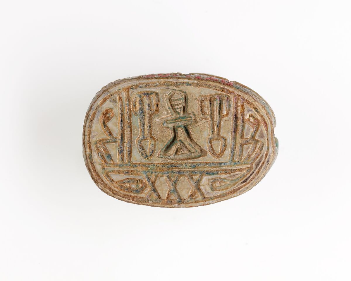 The scarab is inscribed with a symmetric arrangement of hieroglyphs, not meant to form words but chosen instead for their positive meaning.