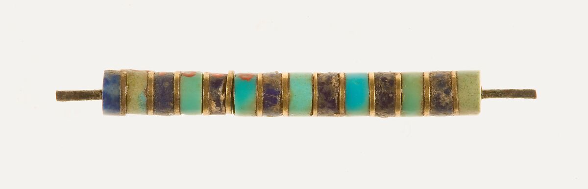 In this example, both ends are lost, but the surviving dowel was created by stringing disks of alternating turquoise and lapis lazuli, separated by thinner ones of gold, over a thin rod to create a pleasing striped pattern.