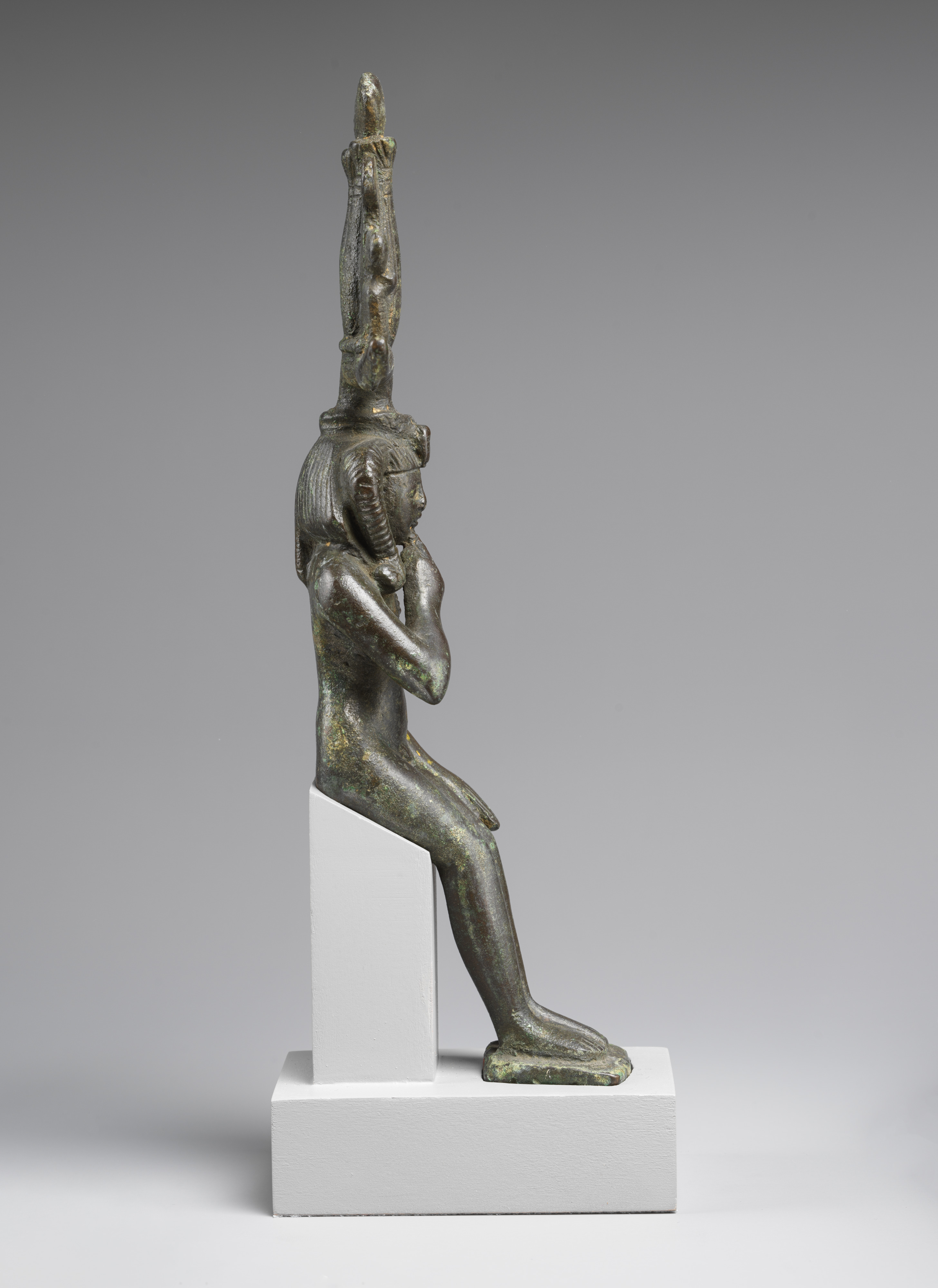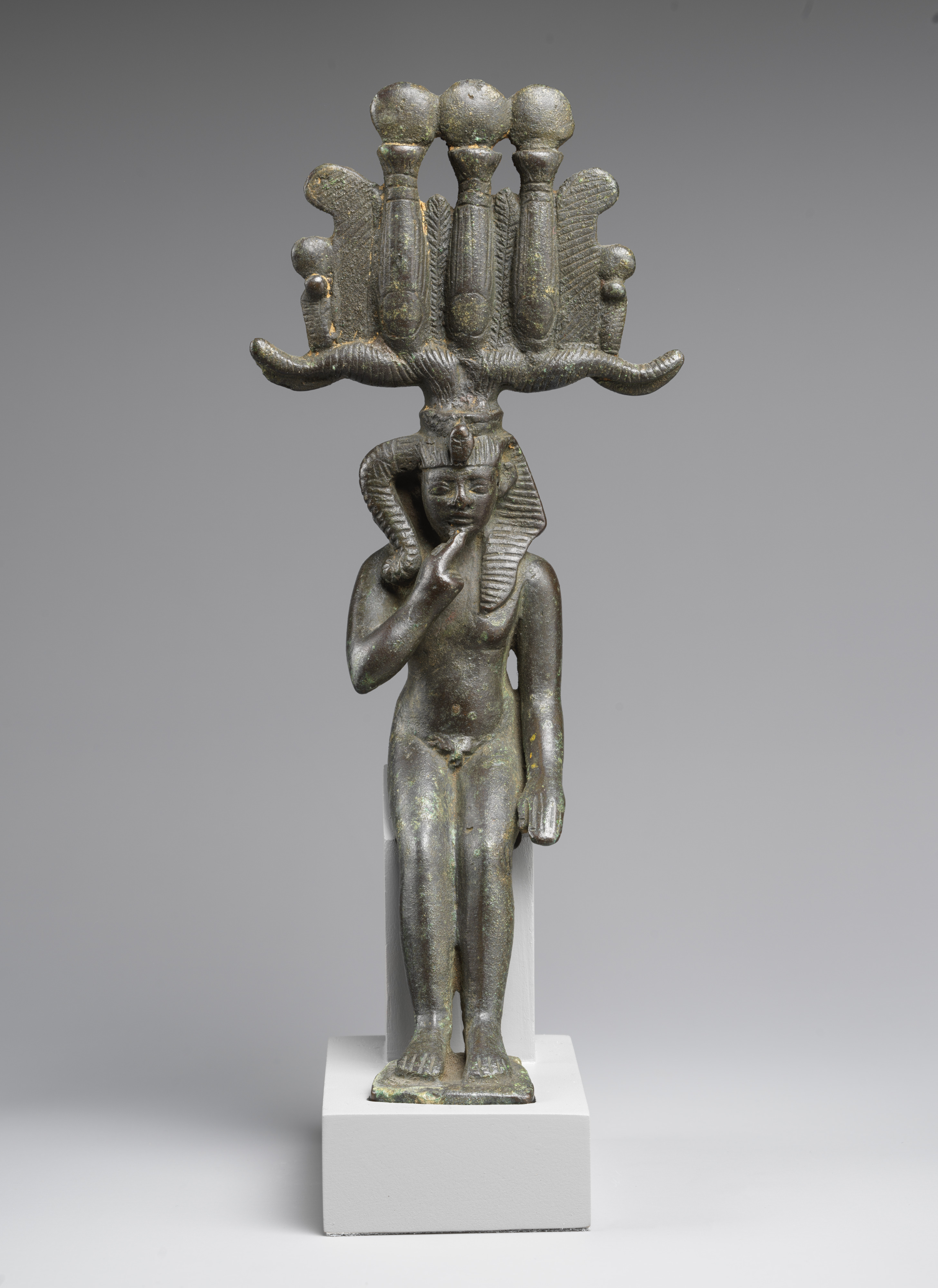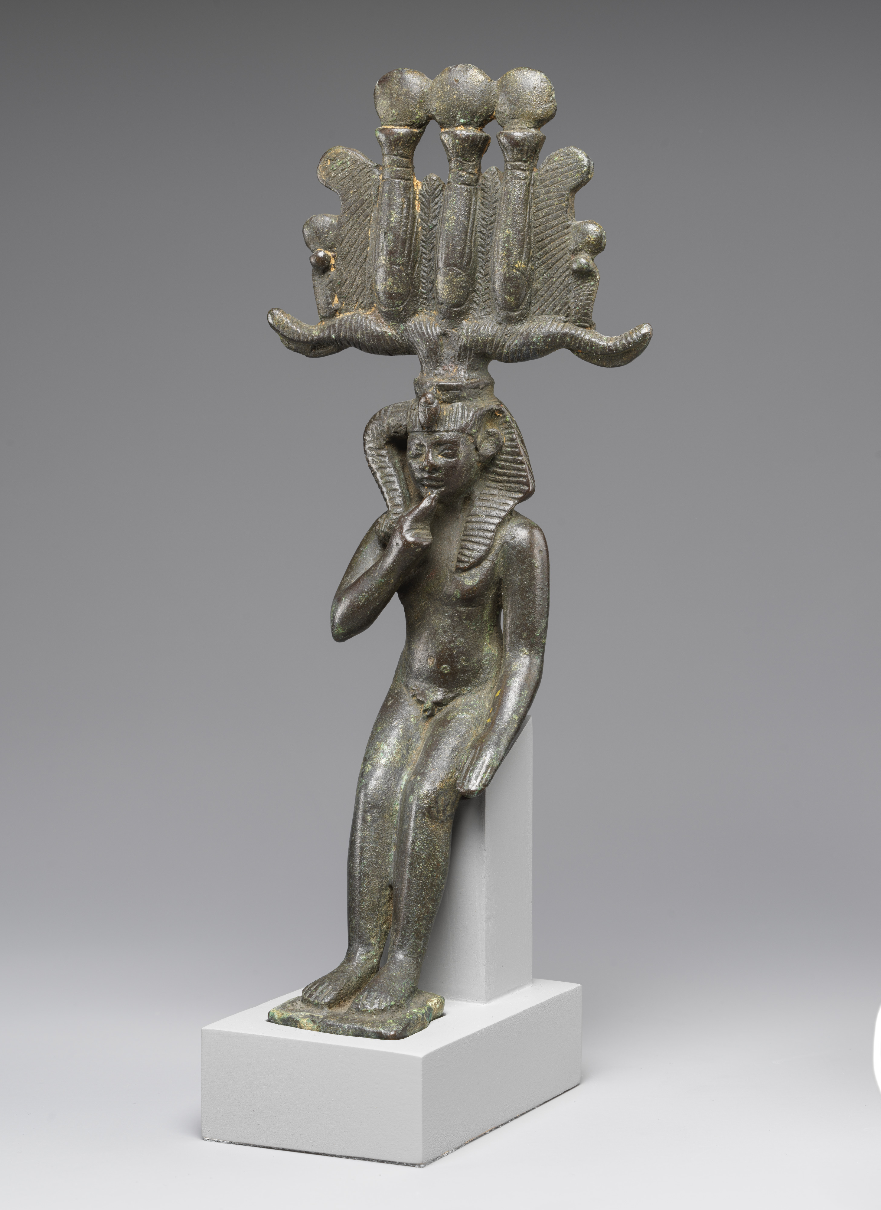 The figure represents a child god in a seated/reclining position, wearing the hemhem crown with the nemes. The hemhem crown was cast separately from the child god, and was inserted and secured at the top of the head. The child god is usually distinguished from adult gods by a range of iconographic clues: his nudity, the finger raised to the mouth (a child-like gesture), and the thick sidelock attached on the right side of his nemes. Child gods are commonly linked with royalty and this god’s hemhem is an elaborate royal crown with solar associations, here emphasized not just by the sun disks at the top of the crown, but also by incised sun disks at the base of each hem element. Meanwhile, the child god’s plump, well-fed belly showcases his ability to bring about prosperity and abundance.