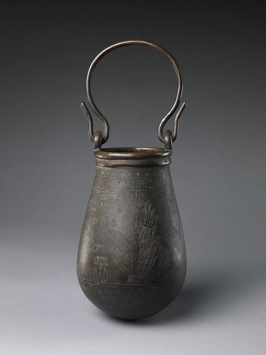 Just below the rim of this situla is a band of stars indicating the sky, and beneath that is a register of inscription which asks that the 'Great Praised' Penmin give life to Hetepkhonsu, and names various other individuals whose relationship is not entirely clear.Two scenes cover opposite sides of this vessel. In one scene a tree goddess, named here as Nut, pours water down over Penmin on the right and his ba (in the form of a bird) on the left. In the other Penmin adores across an offering table the gods, Osiris, Isis, Nephthys, and Harsiese. A lotus design clasps the rounded bottom of the vessel.