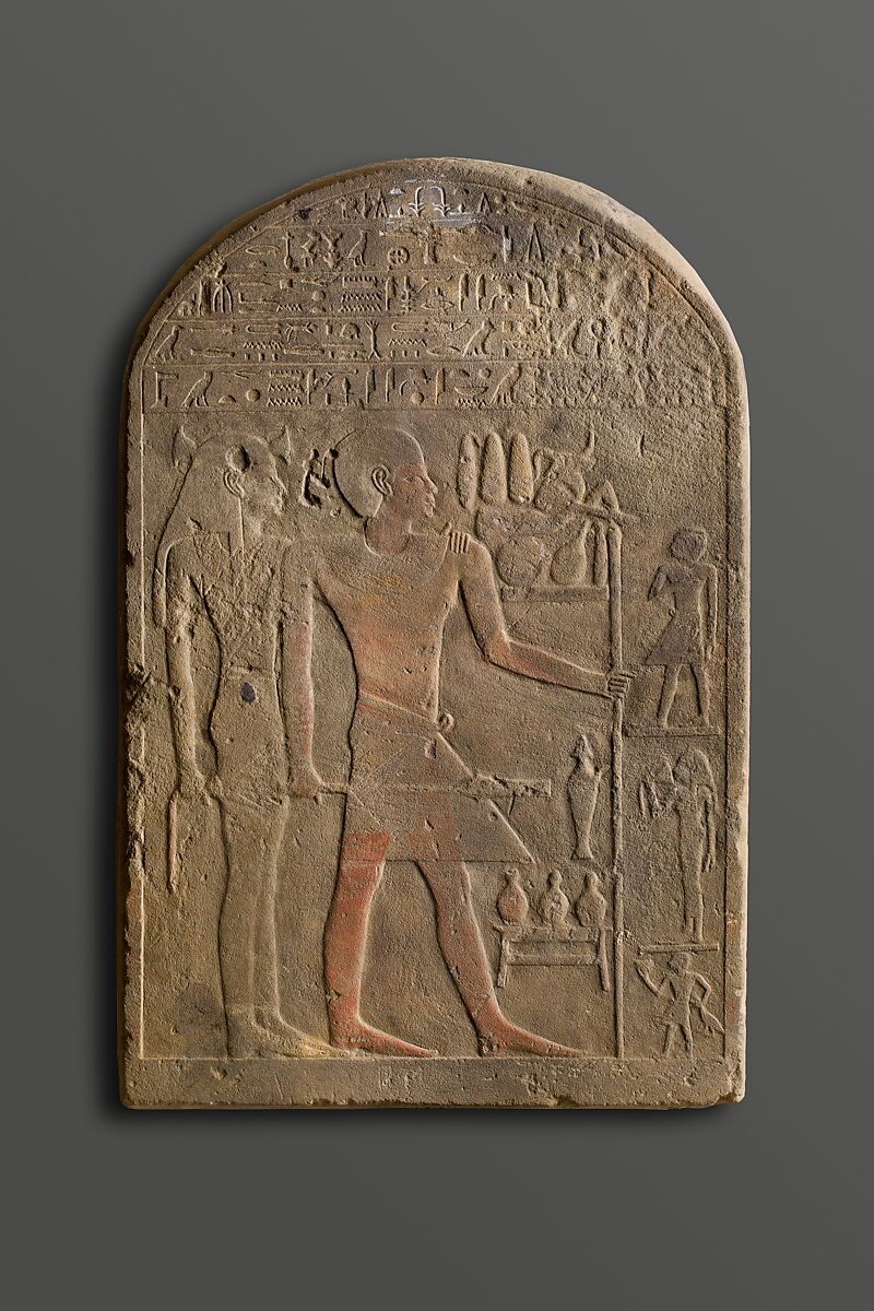 This fine round-topped stela belongs to an official named Amennakht. In the large scene that takes up the bottom three-quarter of the stela, the owner is shown accompanied by his wife, whose name is not recorded. Amennakht has short hair, and wears a broad collar and a starched short kilt. He stands with one foot forward, holding a long walking stick in one hand and a shorter staff of office in the other. Despite some erosion on the surface, red pigment remains on much of his skin. Amennakht’s wife wears a long sheath dress, and her head is adorned with two ornaments in the form of papyrus umbels. She places one hand on her husband’s shoulder and holds a water lily blossom, a symbol of regeneration, in the other. In front of Amennakht’s face is a pile of food offerings placed on a mat. A tall, slender libation jar known as heset and three ovoid jars placed on a rack also appear in front of his legs. On the farthest right are three ground lines, each supporting a small-scale unnamed figure. On top stands a man, perhaps the couple’s son, wearing a short kilt and placing one hand over his chest. In the middle is a woman, perhaps the couple’s daughter, holding a water lily flower up to her face. On the bottom is a very small man, probably a butler, presenting a cup and bringing a fowl as an additional offering. The five lines of inscription in the top portion of the stela include an offering formula and an appeal to the living, both meant to magically sustain Amennakht for eternity.