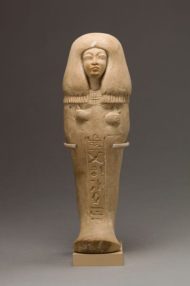 This funerary figure belonged to a woman who had the title Singer of the Aten, the god worshipped by Akhenaten. Althought similar to a shabti, this figure is not inscribed with chapter six of the Book of the Dead (the shabti spell) and makes no mention of the funerary god Osiris. In a seeming paradox, but one that speaks of the strong psychological and cultural ties of ordinary Egyptians to the traditional religion, the owner is called Isis, the name of the great funerary goddess who was the wife of Osiris. The facial features, including the so-called "sfumato" eyes, closely resemble the style of Amarna.