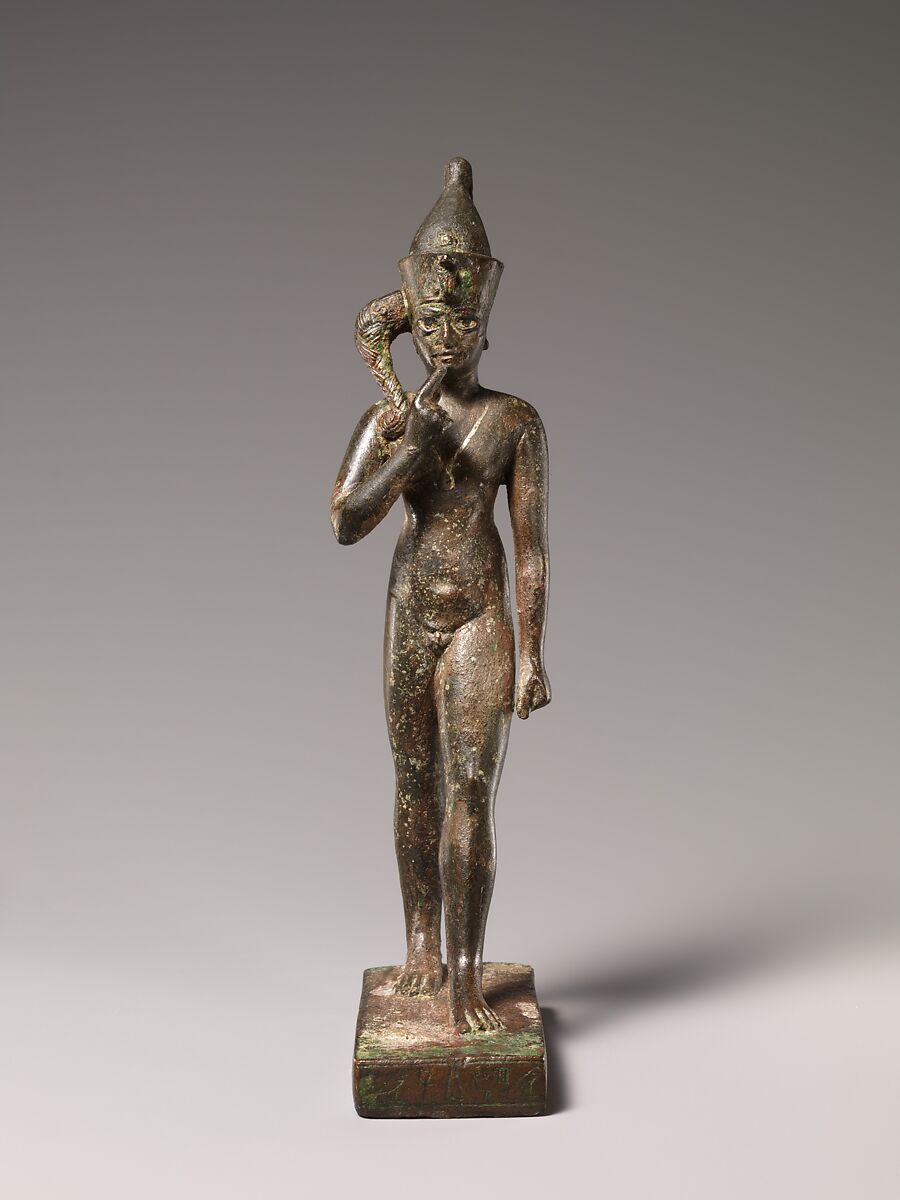 The figure represents a child god in a striding/standing position, wearing the double crown, which alludes to his royal status. The child god is distinguished from adult gods by a range of iconographic clues: his nudity, the finger raised to the mouth (a child-like gesture), and the sidelock on the right side of his head. The sidelock was separately cast and mechanically attached using a small pin, which is still visible near the head. Silver inlay, meanwhile, highlights his eyes and the amulet on his chest. The amulet is suspended on a string that knots at the back of the neck, and it is a common attribute for child gods.
