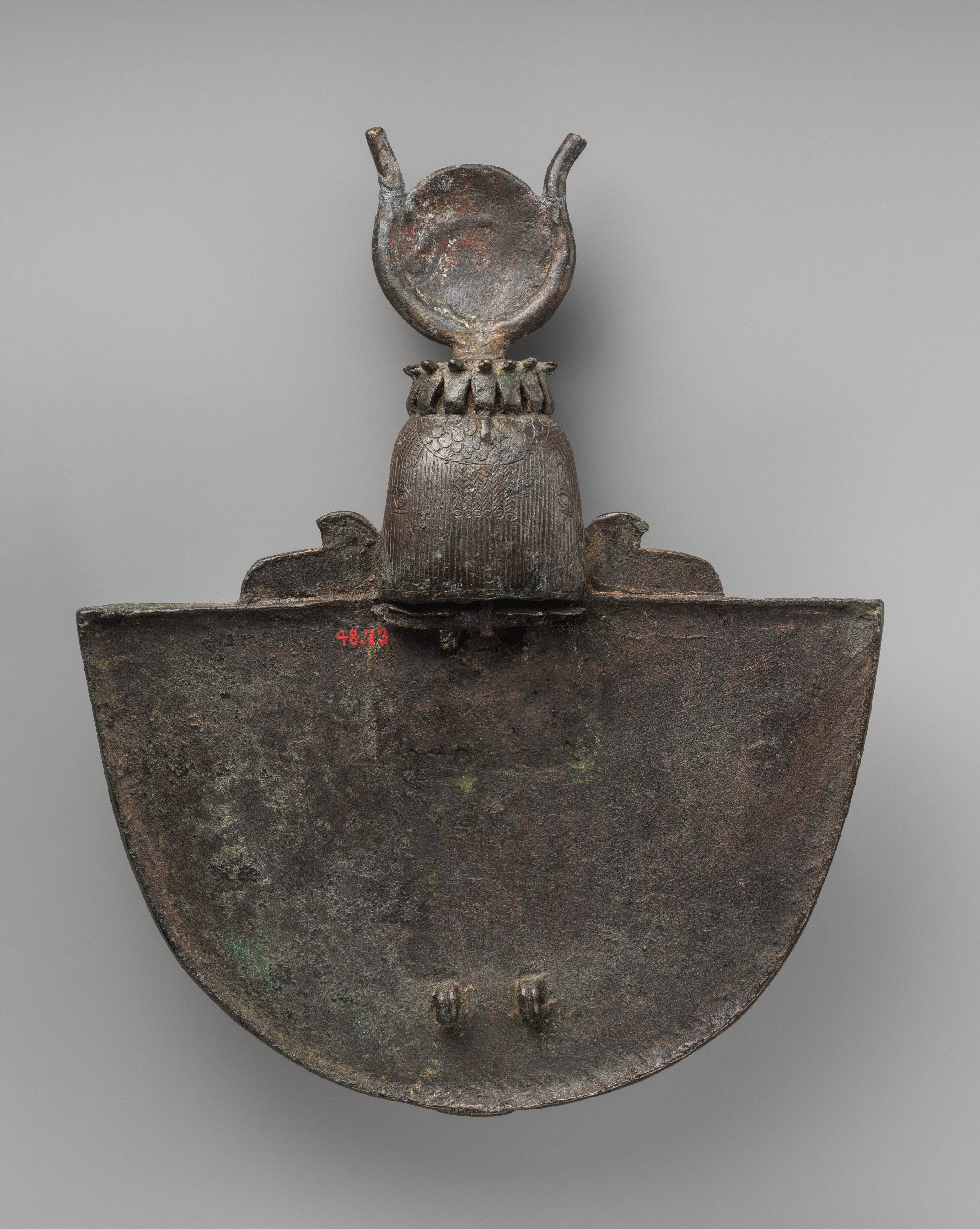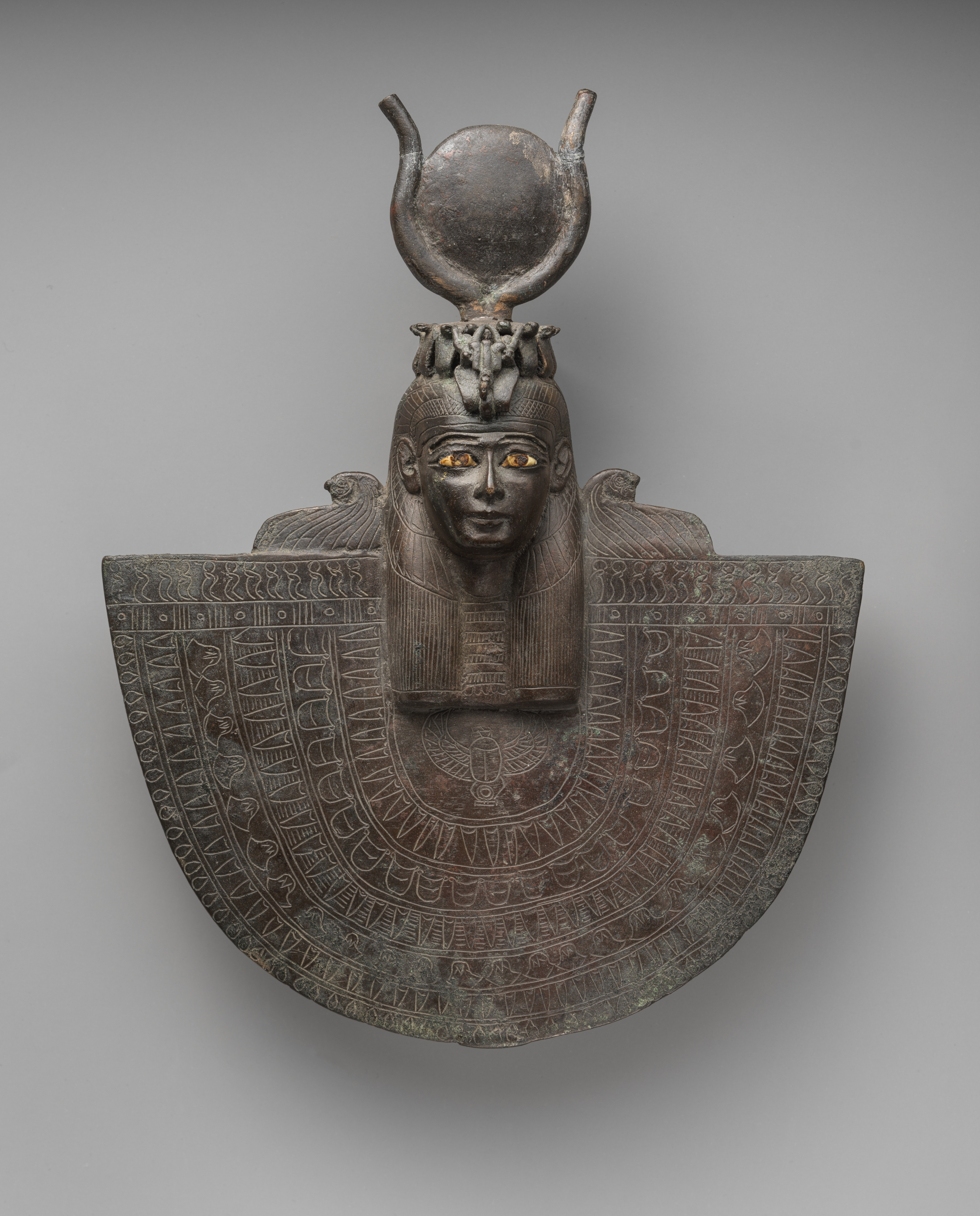 On top of the collar is the head of a goddess wearing a tripartite wig with a vulture headdress and a modius of uraei surmounted by a sun disk between lyre-shaped horns—attributes associated with both Isis and Hathor. Her inlaid eyes enliven her divine presence. The scarab with a shen ring between her wig’s lappets symbolizes rebirth and eternity.