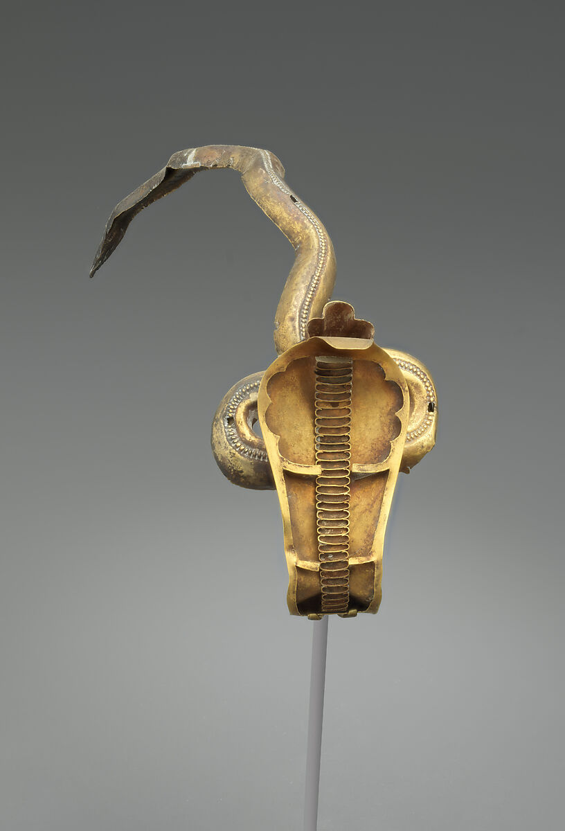This uraeus is assembled from hammered gold and electrum sheets and strips; the snake's head and hood form one component, which was inserted into the coils and tail that form a second. The separate head element and inlays of the first component are now missing.The uraeus hood was probably originally inlaid in colors of red, turquoise, and dark blue. Traces of Egyptian blue suggest that material may have been used for some of the inlays. The long shallow curve of the tail would seem to suit a funerary mask, but the uraeus had been deformed and was restored, so the shape is not original.