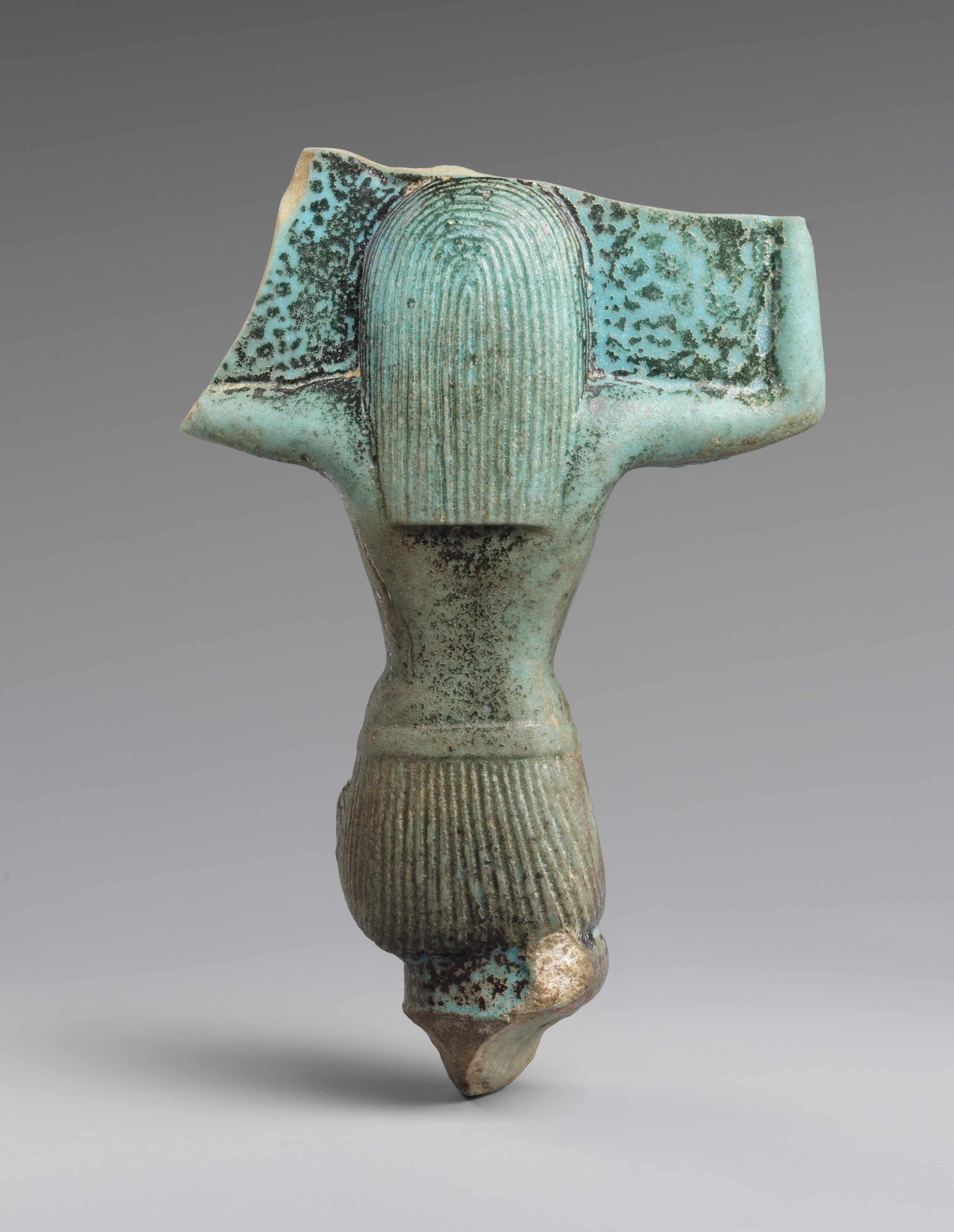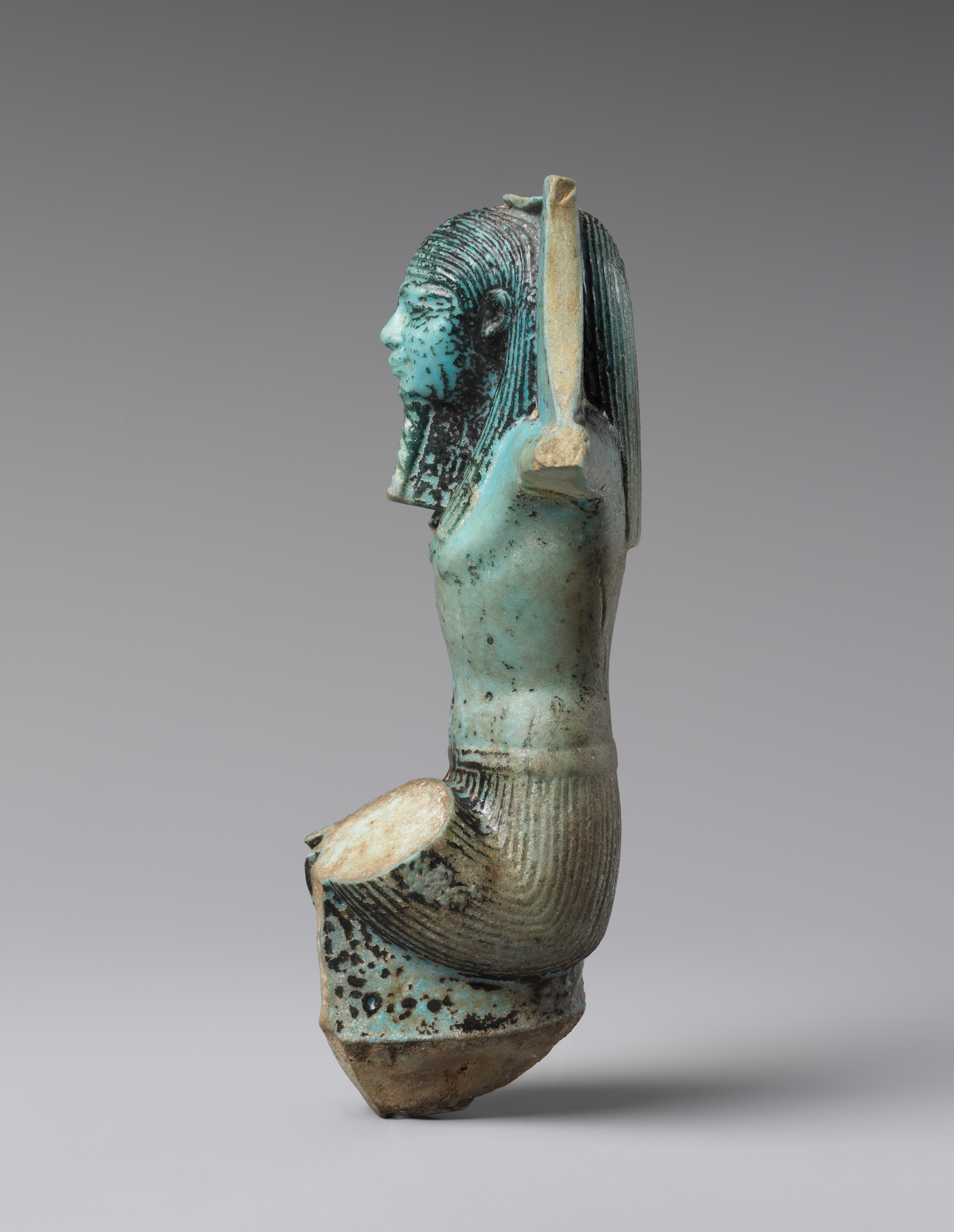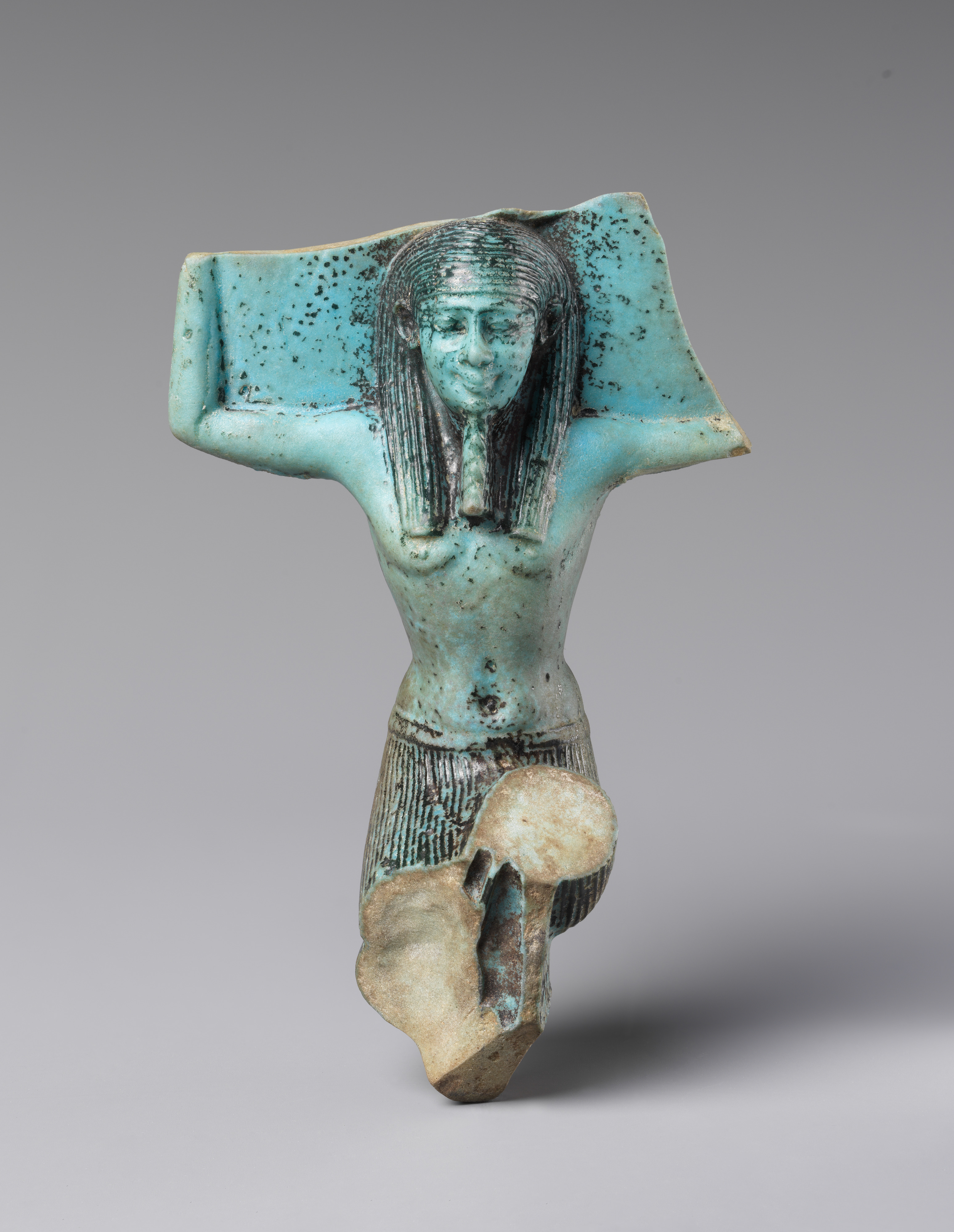 This exquisite figurine depicts a kneeling god with his arms raised, a gesture that is well known in representations of the gods Shu and Heh. Although the piece is incomplete, small remains of a raised object on the top edge show that the god had a sun disk on his head. This is known for both gods, although it is more likely that Shu is represented here.