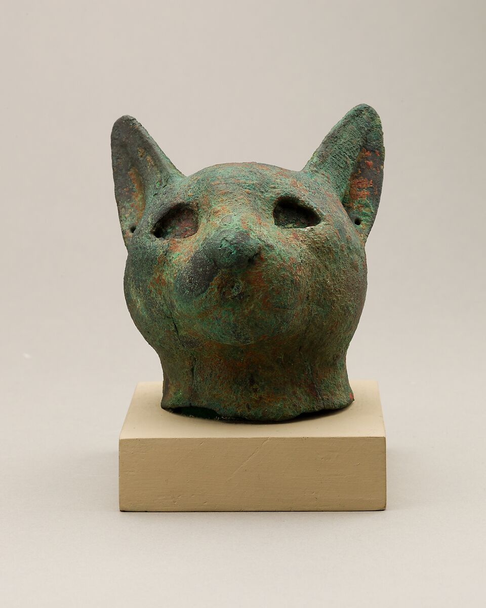 The cat was sacred to the goddess Bastet, and was offered in sanctuaries and deposited in animal necropoleis throughout Egypt. This cat has a soft muzzle and a round face. Both ears are pierced and would have had earrings, probably of precious metal.