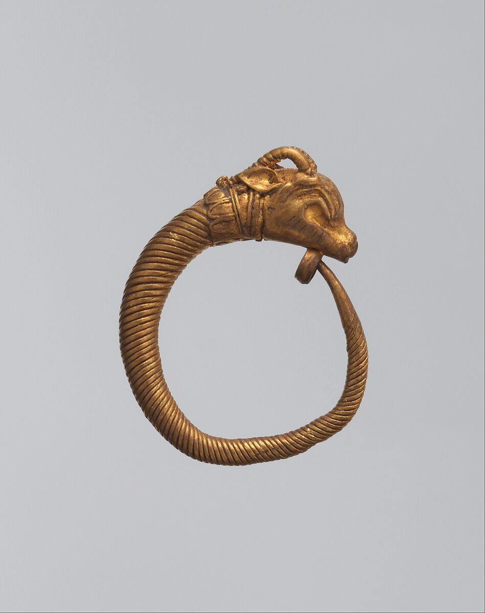 Hoops formed of wound wire with animal head terminals are the commonest type of Hellenistic earring. The heads on these earrings have been referred to as those of gazelles, but is now thought more likely to be an ibex. Ibex-head earrings are well-known in Egypt, but also Asia Minor and Cyprus.