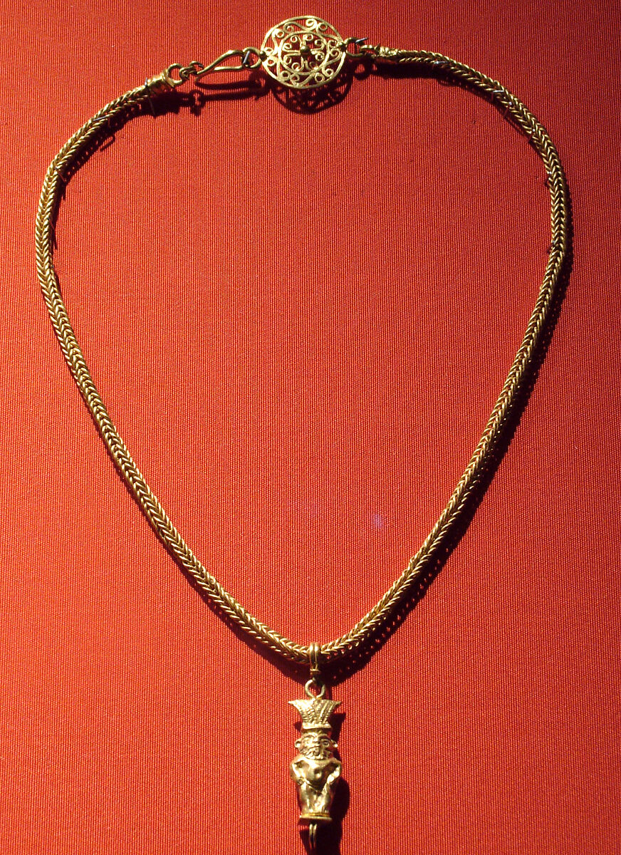 - Title:Loop in loop chain with intricate openwork medallion at the clasp and a gold Bes pendant