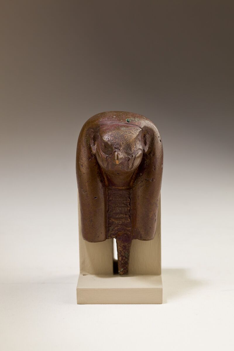 This falcon head is an attachment that would have been part of a larger, more imposing piece of cult equipment, possibly part of a piece of furniture, a shrine..