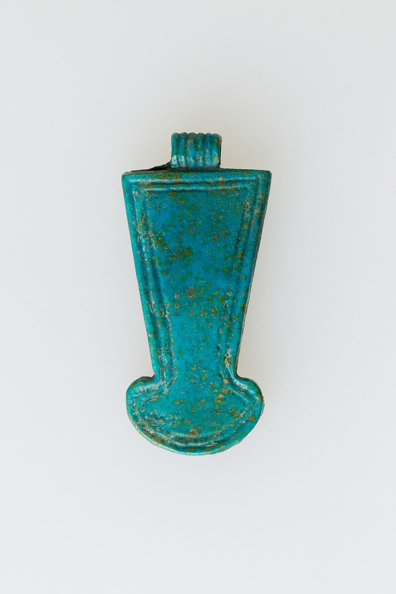 The menat is a term for the counterweight of a menat necklace, a heavy set of beads with counterweight sacred to great female goddesses in particular who were appeased by the sound of the shaken beads. The counterweight served as a symbol of the whole elaborate necklace. The menat remained an important magical amulet throughout Egyptian history, serving to propititate the great goddesses and evoke their powerful protection.