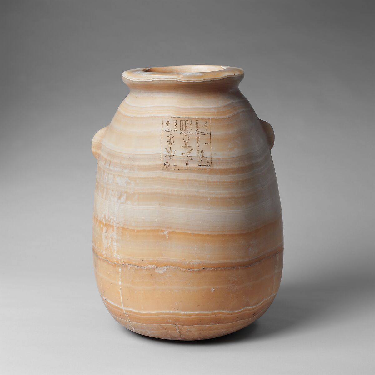 The incised inscription on this large jar identifies the contents of the vessel as "Special ointment of the Manager of the Red-Crown Enclaves and Chief Physician, Harkhebi." The man to whom the jar belonged probably lived in the Delta town of Buto; the "Red-Crown Enclaves" was an ancient area of that town, and his name, which means "Horus of Khemmis," refers to the site near Buto where the infant Horus was hidden by his mother, Isis, as described on the Metternich Stela (No. 51).