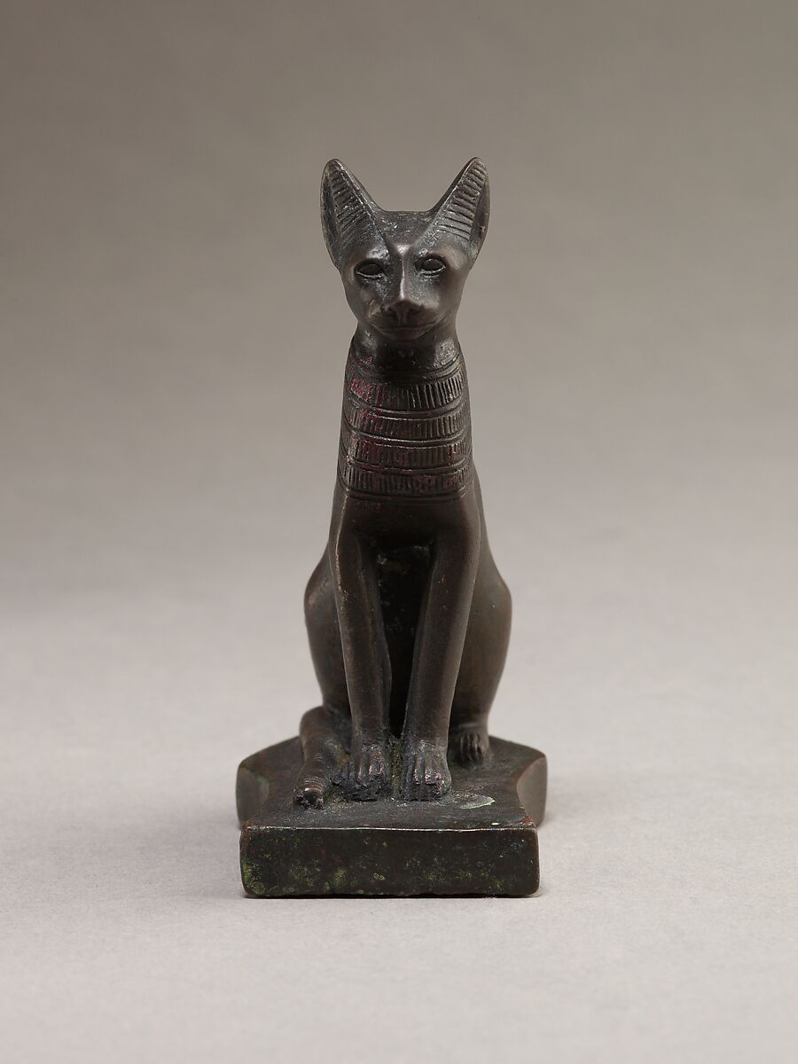Cat statuettes were among some of the most common zoomorphic dedications of the Late and Ptolemaic Periods. Small statuettes like this one would have been dedicated as offerings to temples or deposited in catacombs alongside cat mummies, as at the extensive catacombs at Bubastis and Saqqara. Sometimes larger hollow examples held a cat mummy inside.