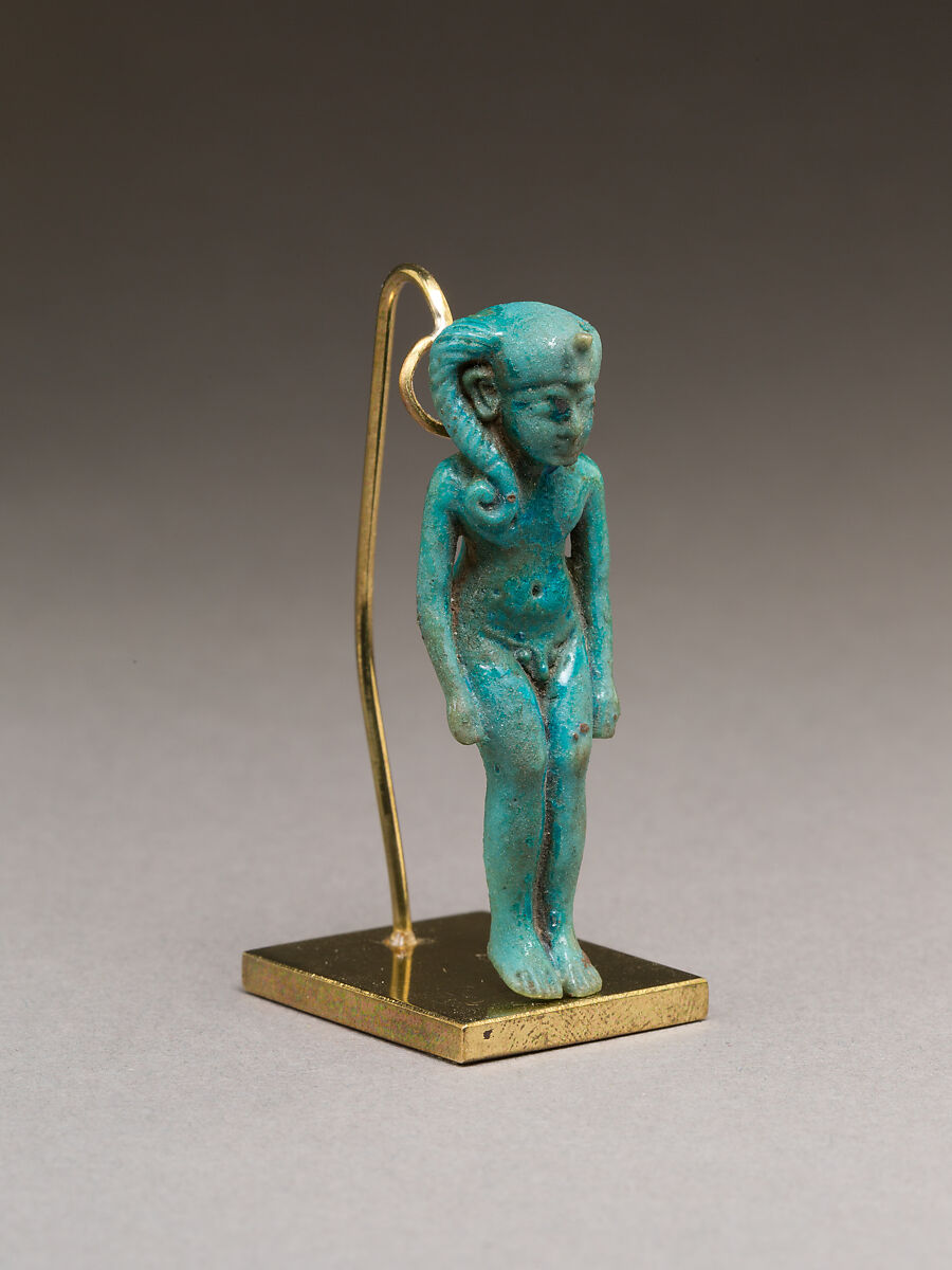 The richly colored turquoise faience figure represents a child god in a seated/reclining position, as he would have been held on his mother's lap. The child is distinguished from an adult gods by iconographic clues: his nudity and the sidelock on the right side of his head that is a sign of childhood.