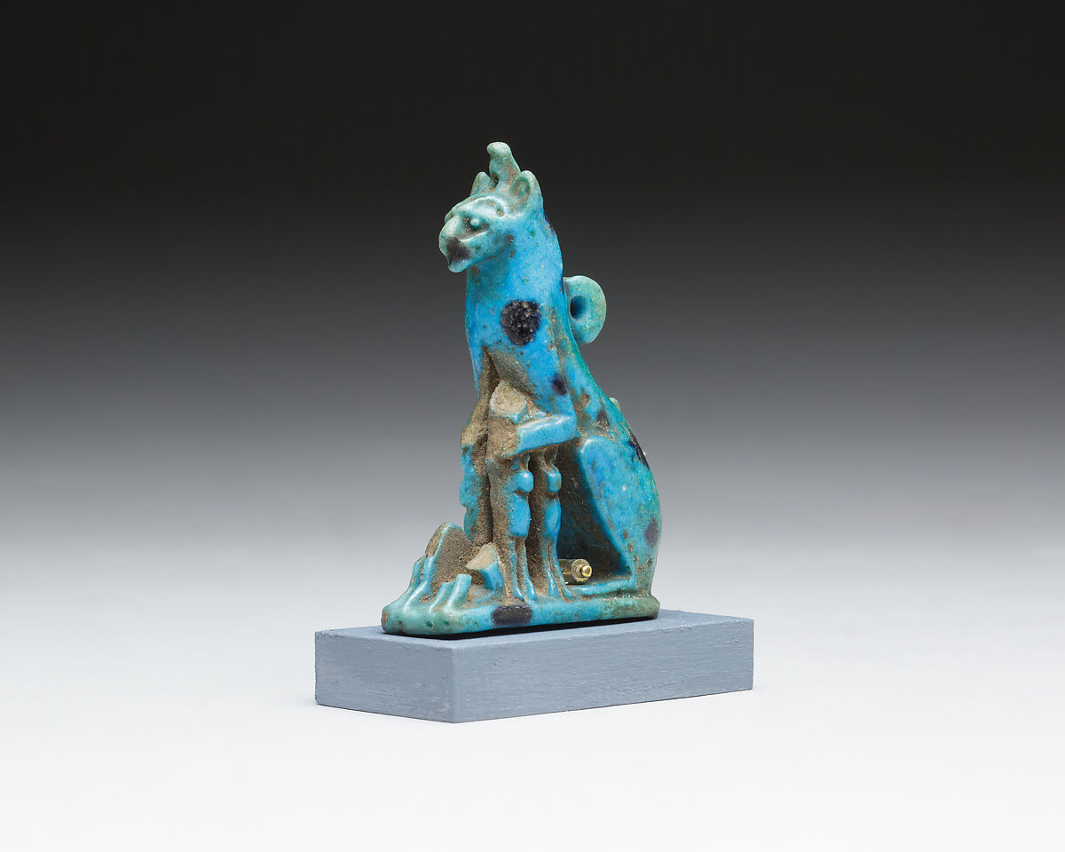 This figure is part of a repertoire of figures created in a distinctive spotted faience from Dynasty 22 into Dynasty 26. The center of production was the eastern Delta, in particular Bubastis and Tanis; this was an area where Near Eastern peoples had long been interwoven in the population; at this time it was also a center for the settlement of Libyan tribal peoples. Possibly these conditions influenced this particular production.