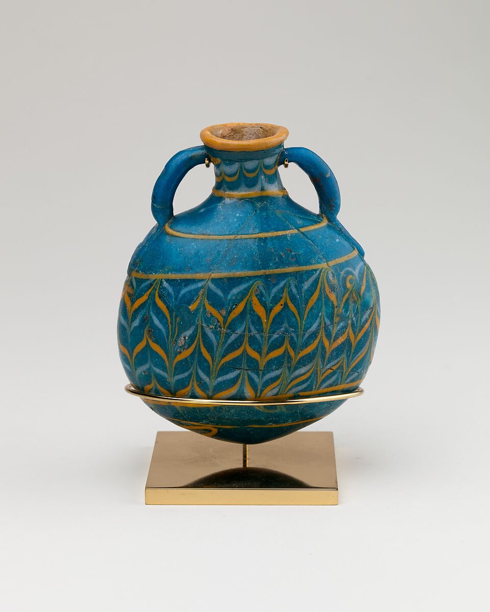 Egyptian glassmaking, which had reached a high level of virtuosity in late Dynasty 18, continued to be practiced in the Ramesside Period; however, the quality, as well as quantity, of it production dropped off sharply in Dynasty 20. The "feathered" decoration of this bottle was achieved by winding thin colored glass rods around the vessel and pressing them onto the surface of the vessel while it was still soft, and then drawing the rods up or down with a metal instrument.